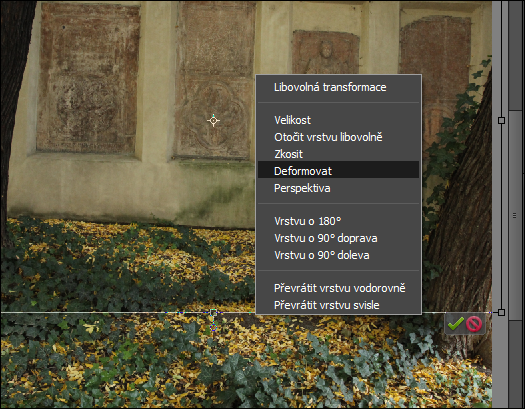 Je to tam všechno takové divné. Kameny a římsa jsou nakřivo, stromy nepasují, je to na levačku. Naštěstí víme, jak z toho, už jsme se o tom tady zmínili. Transformace, to je ta správná medicína! Příkaz Ctrl+T ji aktivuje a když pak klikneme dovnitř obrázku pravým uchem myši, můžeme volit deformaci: