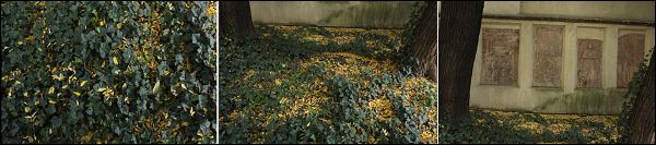 Vysokému ISO se nedivte, byla tam hodně tma. Jenže ono to lze pojmout i jinak. Dole, hned u vašich nohou, je zajímavá struktura – listy břečťanů a popadané žluté lístky akátů. No a jsou tam i kmeny těch akátů a vzadu náhrobky. Vyfotíme to tedy na tři snímky, pěkně zdola nahoru, s přesahem, jako panorama: