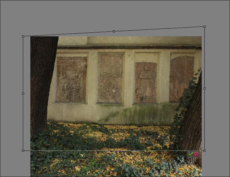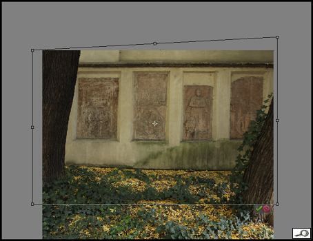 Je to tam všechno takové divné. Kameny a římsa jsou nakřivo, stromy nepasují, je to na levačku. Naštěstí víme, jak z toho, už jsme se o tom tady zmínili. Transformace, to je ta správná medicína! Příkaz Ctrl+T ji aktivuje a když pak klikneme dovnitř obrázku pravým uchem myši, můžeme volit deformaci: