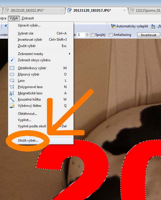 Od této chvíle jsme připraveni čarovat s písmem a výběry. Pokud chci zůstat u prvotního obrázku (Nora na křesílku), vrátím se pomocí Ctrl+Z před aplikaci písma a volím Výběr – načíst výběr.