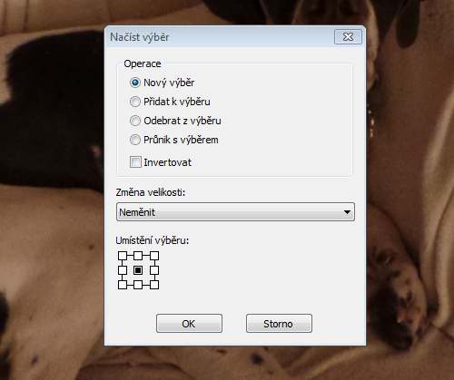Zde jsou různé parametry, výchozí volba je Nový výběr, ale dovedete si asi představit, že můžeme různé výběry kombinovat – otevřená karta to napovídá. Na umístění nezáleží, protože výběr můžeme libovolně po ploše obrazu posouvat. No a nyní nezbývá než tvořit.