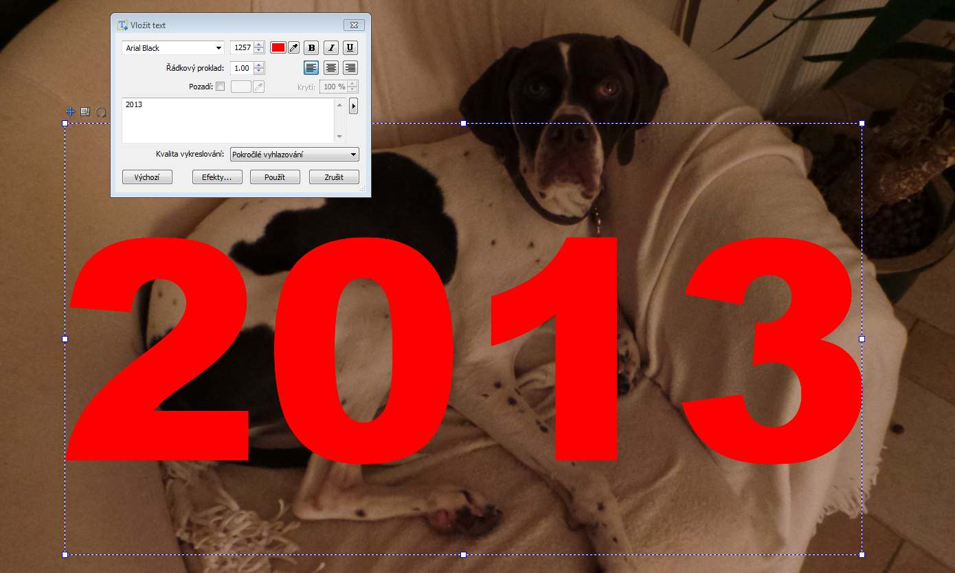 Začátek je jednoduchý. Vytvoříme si nápis jedním ze dvou nabízených způsobů, zde je nástroj Vložit text. Zvolíme druh písma (font) – zde je to Arial Black, jeho barvu, velikost.