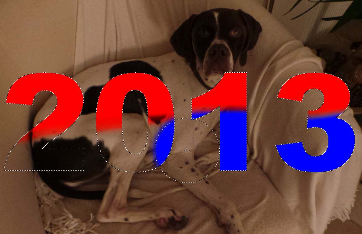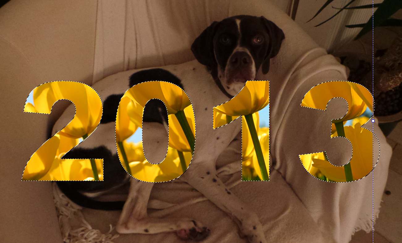 Od této chvíle jsme připraveni čarovat s písmem a výběry. Pokud chci zůstat u prvotního obrázku (Nora na křesílku), vrátím se pomocí Ctrl+Z před aplikaci písma a volím Výběr – načíst výběr.