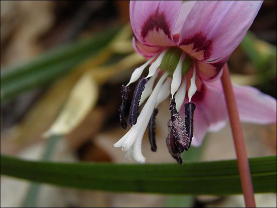 kompakt, má objektiv s fyzickou ohniskovou vzdáleností 4,9 až 147 mm, tedy kratičkou, to makro má dva režimy, vnitřek kytičky jsem fotil v supermakru na vzdálenost cca 1 cm. Na té věci které se tuším říká blizna vidíme zrnka pylu, co víc si přát? Na kliknutí vidíte plnou velikost obrázku.
