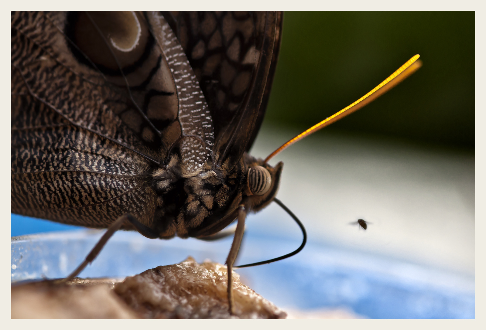Na semináři Dílny jsme fotili motýly ve skleníku Fata Morgana v Praze v Tróji. Makrista nejsem a makristou nebudu, nicméně nějaké poučení jsme si odnesli všichni. O makrofotografii jsem tu v poslední době pojednal hlavně v souvislosti s objektivem Tamron 90/2.8. Však taky moje fotky zde uvedené jsou pořízené právě tímhle Tamronem. Začnu ale fotkou Jany Beckové. Vidíte tu mouchu? Musíte mít taky trochu štěstí…