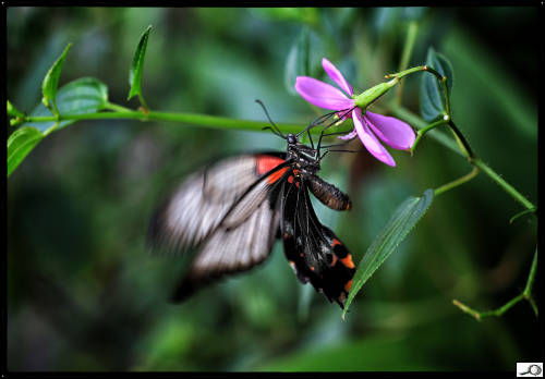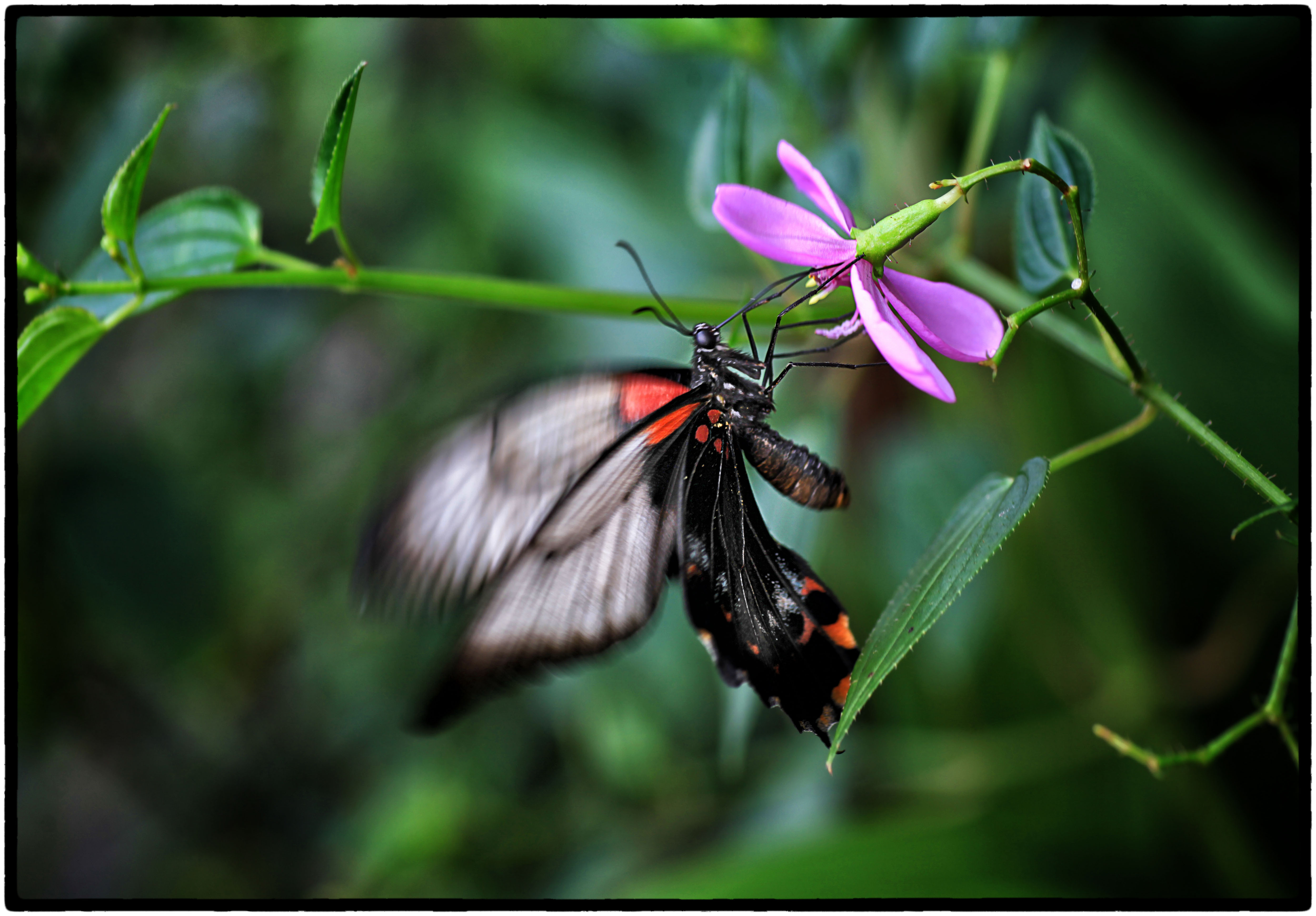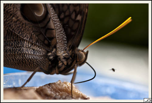 Je to řehole, tohle makrofocení a nesmírně si vážím kolegů, kteří to dovedou. To třepotání křídel je samozřejmě mázlé, ale myslím, že to nevadí, naopak, že to umocňuje dojem rychlosti. Focení motýlů ve Fata Morgana je nádherný zážitek a zkuste si to také – ještě v těchhle dnech by je tam snad ještě mohli mít. Tihle exotičtí motýli jsou velice vstřícní a na rozdíl od těch našich hysterických bělásků se nechávají krásně fotit. Hlavně je nenechte ve středu obrázku, to je kompoziční zásada z odstavce jedna, stránka jedna první kapitoly pojednání o kompozici…