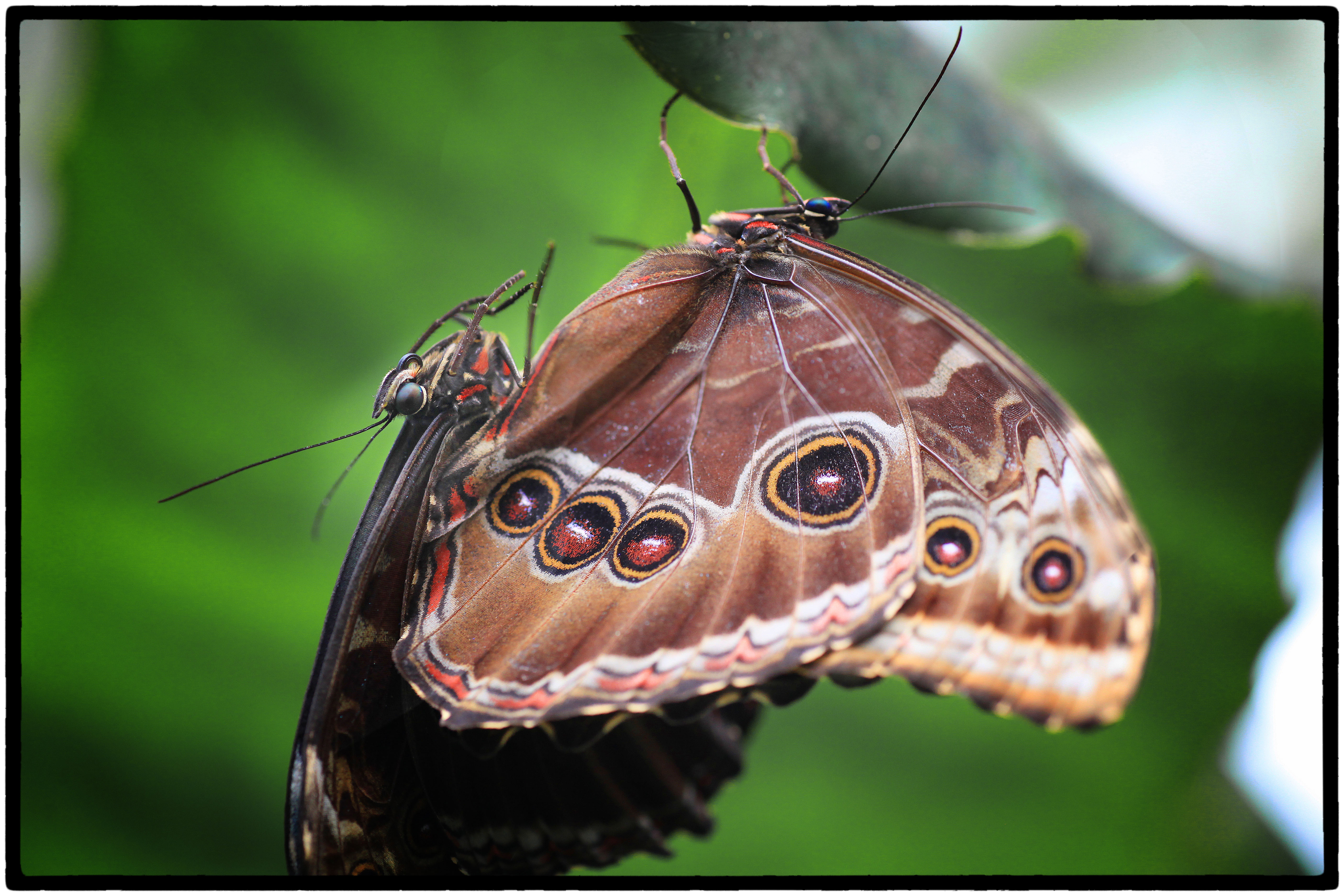 Trvám na tom, že hlava, najmě pak oči, musí být ostrá. Jak to ale udělat, když je hloubka ostrosti tak malá? Motýli jsou dva, jsou tedy dvě hlavy k řešení. Která má být ostrá? No samozřejmě obě a to z důvodů optických nelze. Nezbude buď vzdát se záměru, nebo to fotit nadvakrát, dostat do ostrosti nejdřív jednoho, pak druhé=ho a ve vrstvách je v Photoshopu (nebo jiném vrstevnatém editoru) spojit.