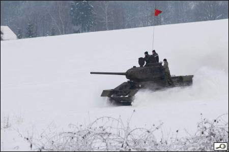 Na focení jsou málokdy ideální podmínky a nejinak to bylo i tady. Samozřejmě že by bylo nejlíp fotit to hodně zblízka, jenže nechat se přejet tankem “nedělá dobře, když na to neni člověk zvyklej”, jak říká jeden můj kamarád. Takže v tom sněhu se jeden bojí a raději fotí z uctivé vzdálenosti. Tuhle fotku pořídil Jan Mudra: