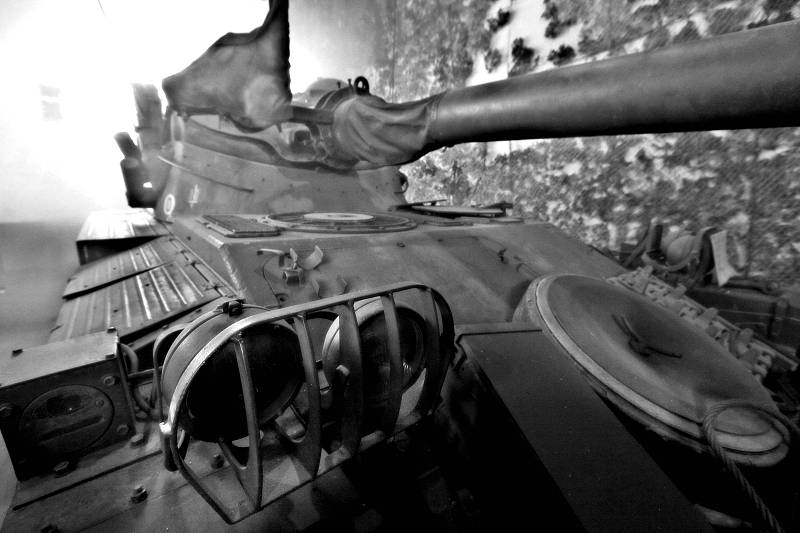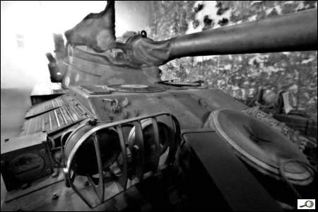 Je to klasicky komponované, jak vidíte, více prostoru ve směru pohybu, nezapomnělo se na rudou vlajku, a křoviny dělají popředí. Moc se mi líbilo i “pod střechou”, tedy v samotném muzeu. Tanky tam vypadaly jako ještěři a 16 mm ohnisko na full frame byla ta správná medicína, jak tu šílenost zdůraznit. Po převedení do černobílé to dostalo ty správné grády: