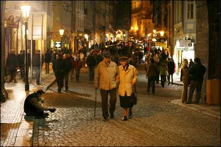 Tahle fotka je pořízena ohniskem ekv. 200 mm při době osvitu 0,6 sec. Má charakter noční fotky a přesto je vše dobře prokreslené: nápadně světlé fasády ovšem prozrazují, že jde o “americkou noc”, tedy ve skutečnosti to je podexponovaný snímek. I ta 0,6 sec stačí, aby se světla jedoucích aut rozmazala. Také někteří chodci jsou mázlí, ale to vůbec nevadí.