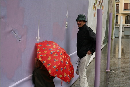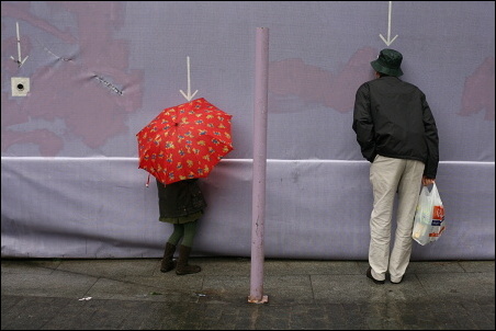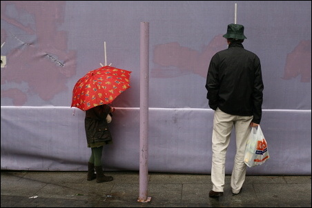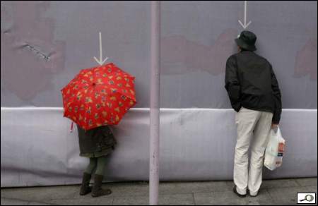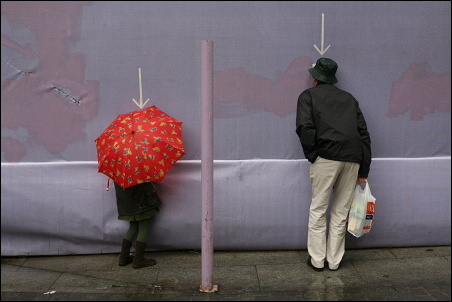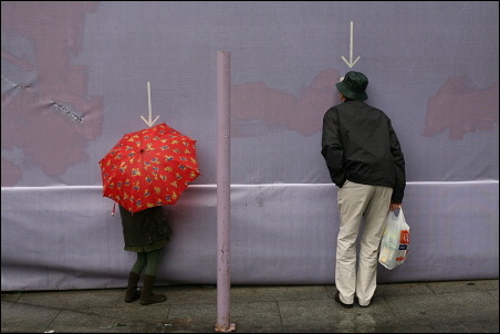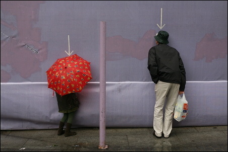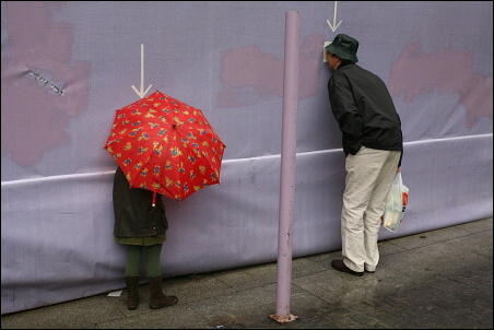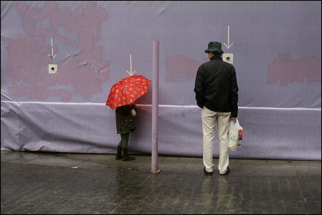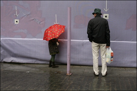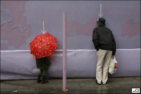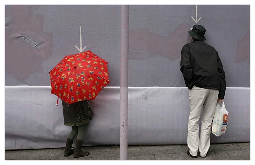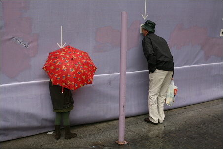 Podotýkám, že ty šipky jsem si tam nepřidělal, ty tam byly. Ti dva, tatínek s holčičkou, koukali dírou skrz ohradu na staveniště. To se v civilizovaných zemích občas dělá, že se lidem umožní dívat se, co se za ohradou děje, tím spíš, když se to děje za jejich peníze poplatníků. Fotek jsem pořídil celkem deset, tahle je sedmá v pořadí. Bylo to takto: