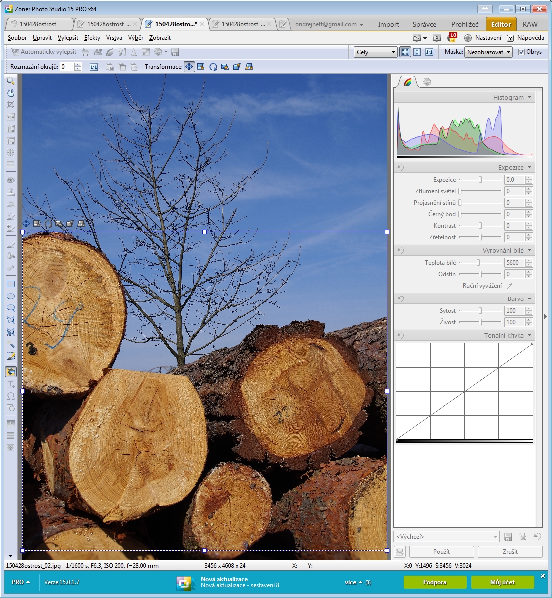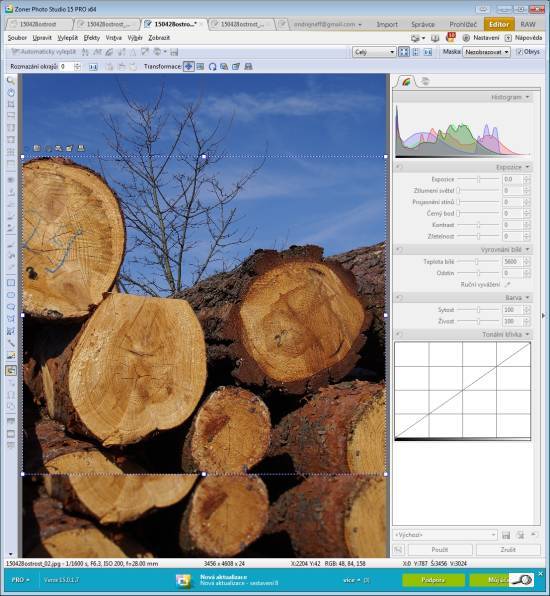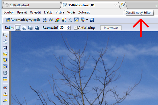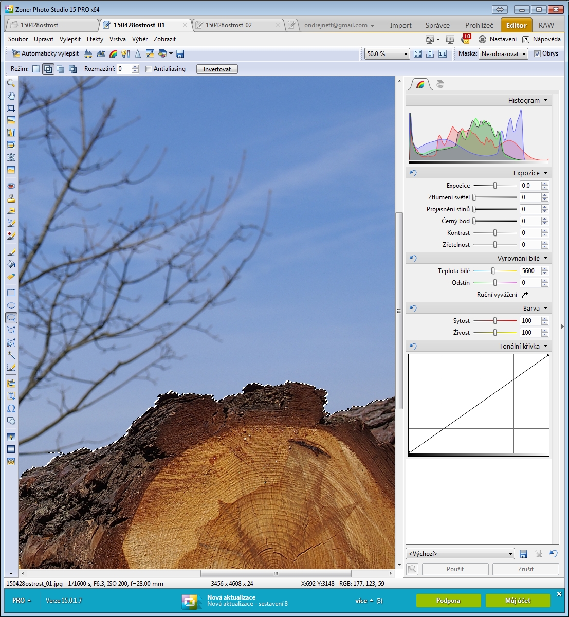 Logicky budeme dávat do výběru a pomocí Ctrl+C kopírovat do schránky ostré popředí. V tomto případě jsem kombinoval funkci Kouzelná hůlka a Laso, nejdřív vybral oblohu plus rozmazané větve a pomocí příkazu Invertovat překlopil výběr na kmeny ve spodní části. Zoner bohužel postrádá užitečnou funkci Rychlý výběr a nechtělo se mi pracně opisovat hranu kmenů lasem. Kouzelná hůlka aspoň částečně suplovala Rychlý výběr (ostatně, on ten Rychlý výběr je modifikace Kouzelné hůlky a je škoda, že se v Zoneru soustřeďují na vývoj formalistických podružností, místo aby obohacovali editor užitečnými nástroji). Takže, dosti nářku, máme výběr hotový, na ukázce je vidět závěrečná fáze, kdy lasem dokončuji výběr na zvětšeném obrázku.