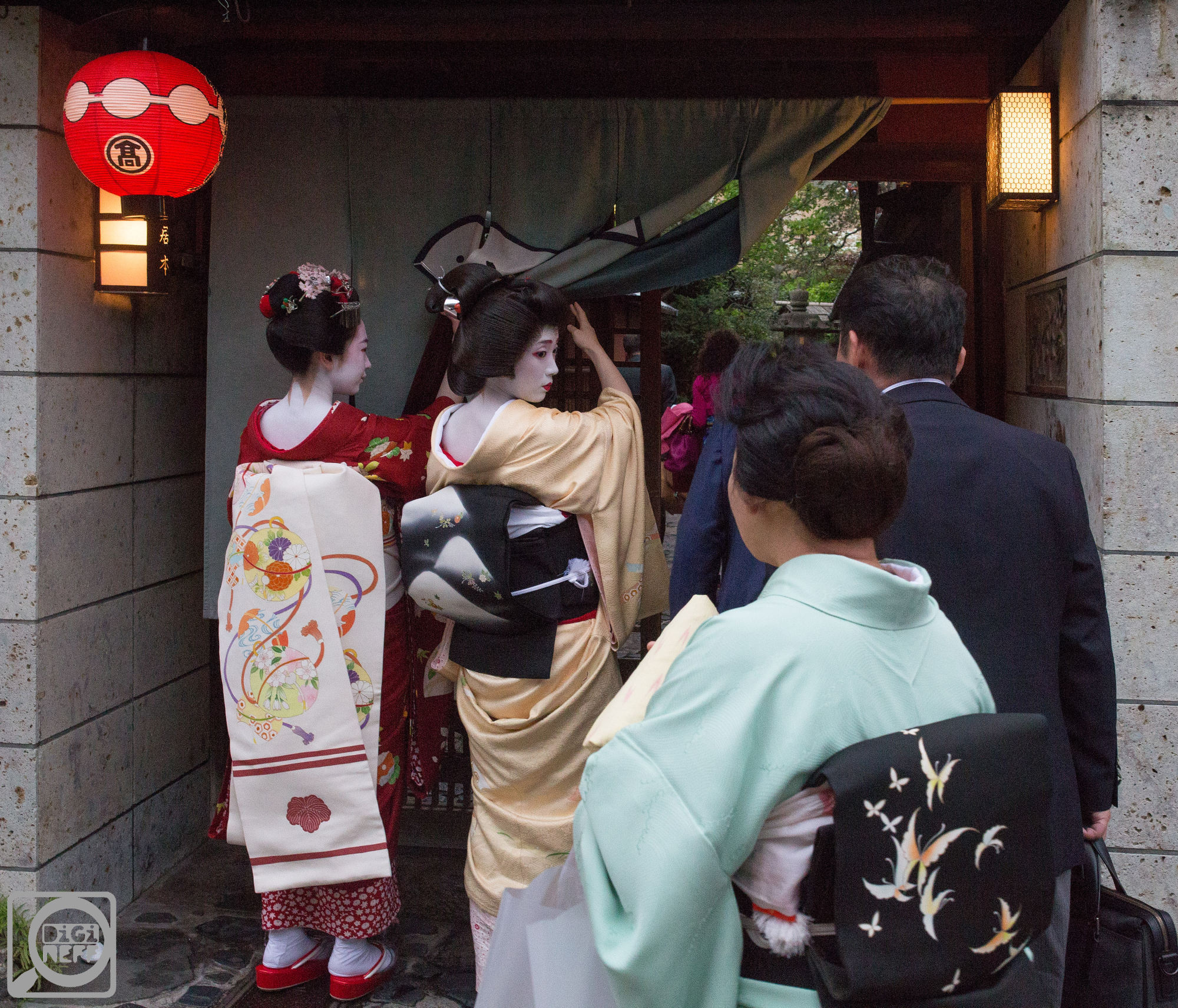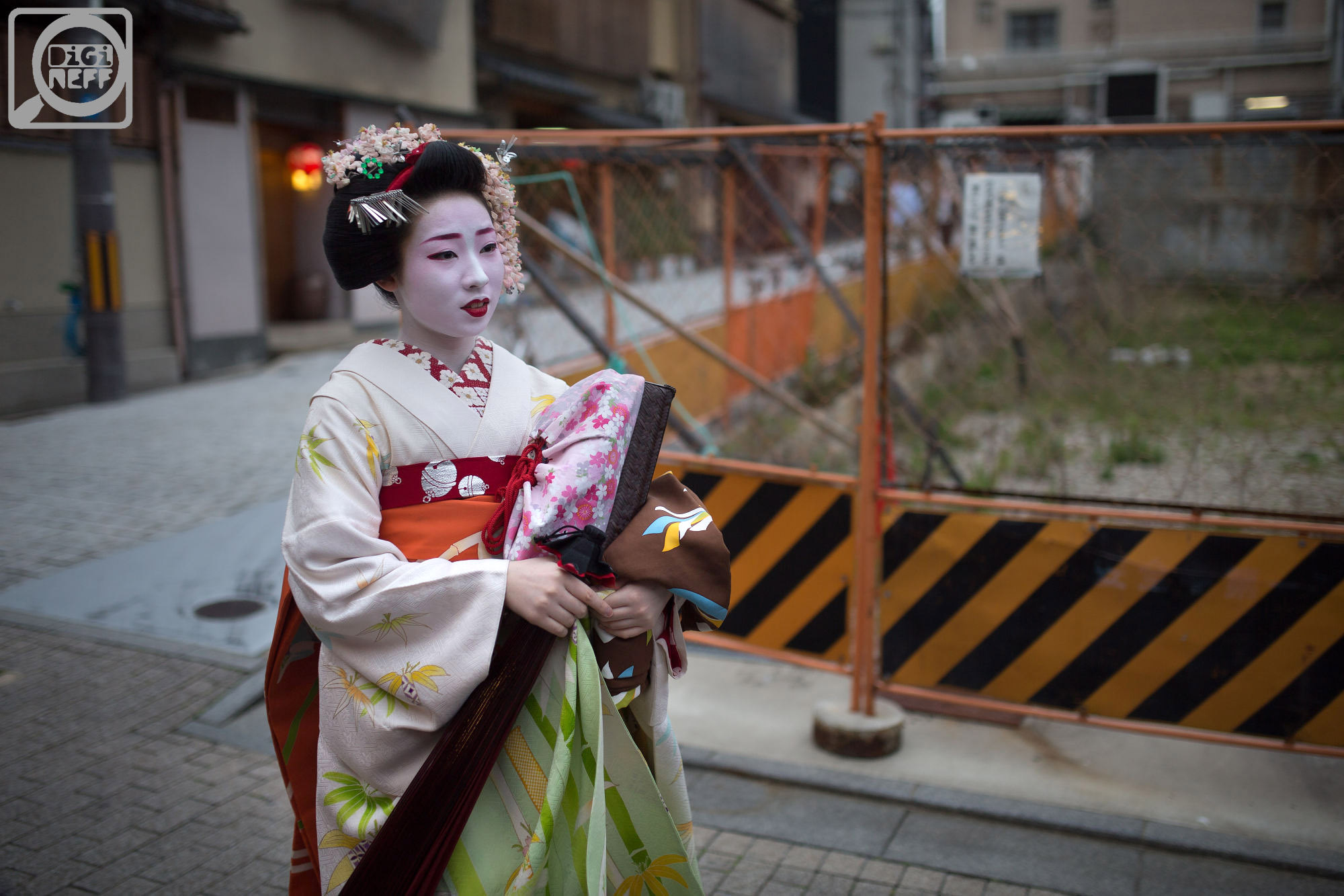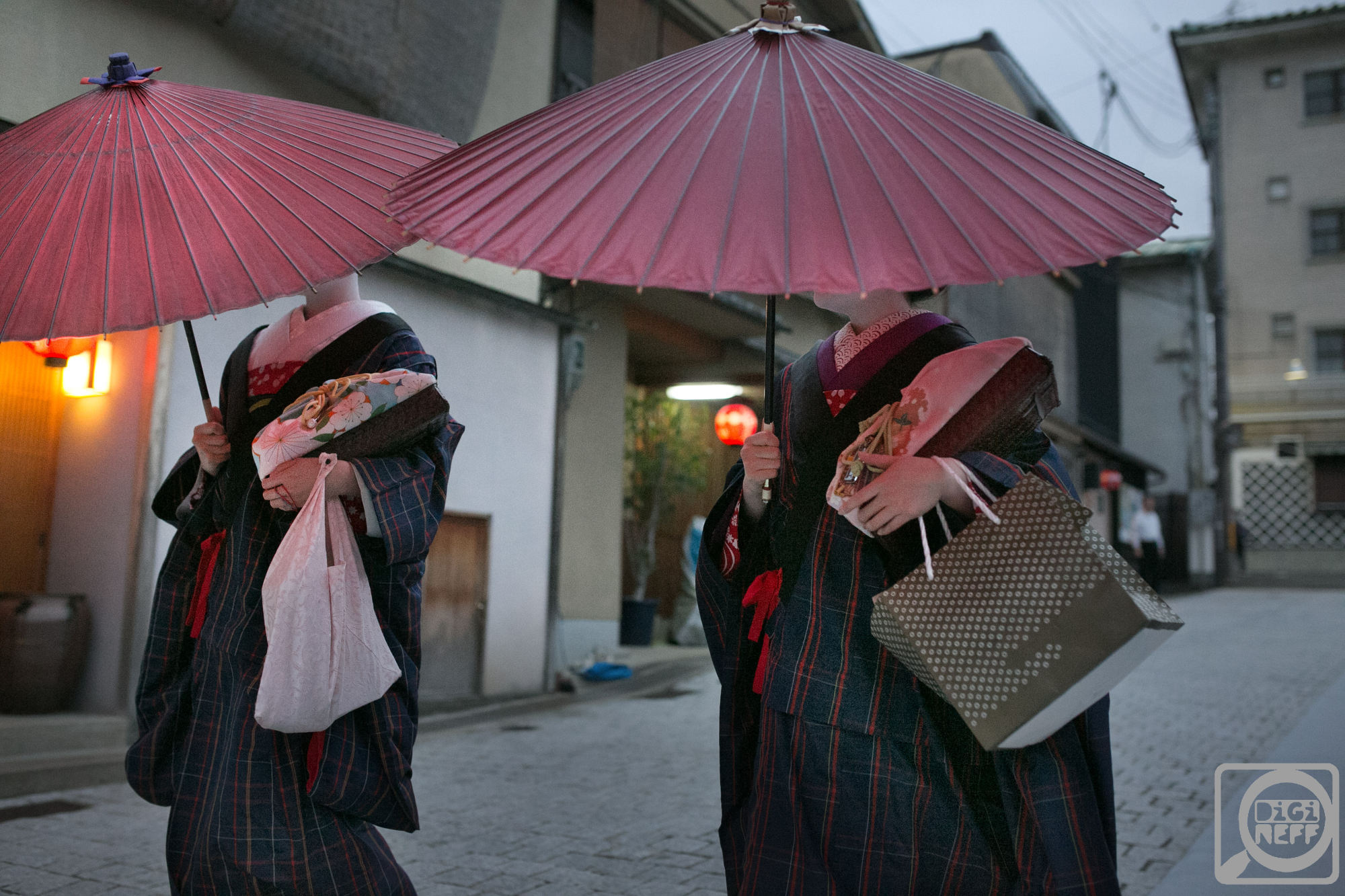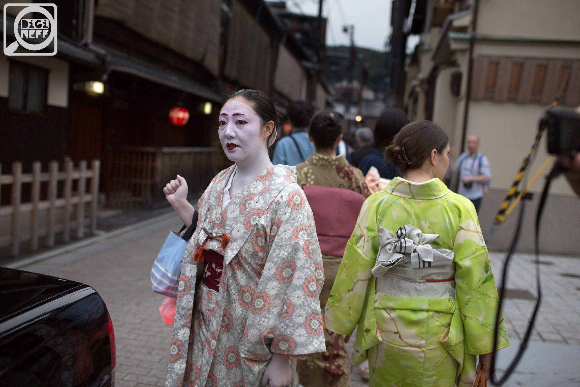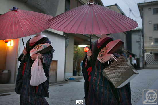 Gejši si nosily kabelky a tašky a pytlíky – a chodily pěšky, možná je obtížné se v kimonu nasoukat do auta. Nechodily daleko, vždycky jen tak za roh…