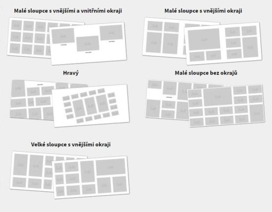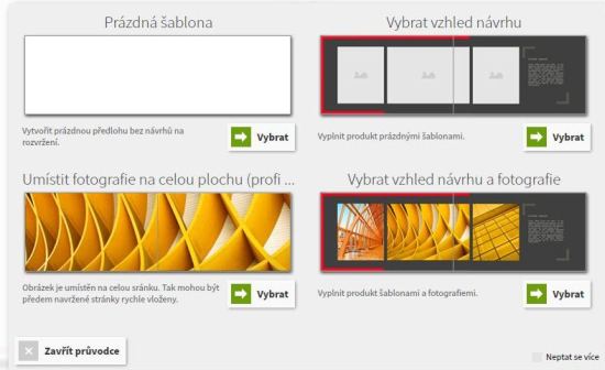 Následuje volba šablon. Jsou zde čtyři bloky, ty dva spodní fakticky předpokládají automatické naplnění knihy. Někdo to uvítá, já to vnímám jako masakr fotek, protože v šablonách převažuje čtverec a tudíž fotky jsou nemilosrdně osekané. Druhá volba v horní řadě Vybrat vzhled návrhu naplní dvojstrany šablonami a pak už jen ručně dosazujeme fotky. Ale i tyto předpřipravené rámečky jsou převážně čtvercové. Proto doporučuji volbu Prázdná šablona. Tam totiž pokud chci – mohu šablony na vybrané dvoustrany doplnit. A nejen to – mohu si šablony vyrobit prostě tak, že si ručně sestavím dvoustranu a rozvržení uložím.