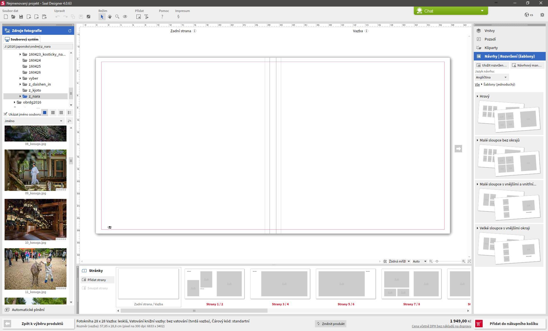 S programem Saal Designer se dobře pracuje, je velmi flexibilní. Příjemné je, že pracujeme na lokálním pracovišti, že se tedy fotky nejdřív neposílají na server. Dobré je, když máme dva monitory a na jednom je zásobník fotek a na druhém pracoviště. Velmi příjemný je textový editor a moc dobré je, že si lze vytvořit vlastní šablony. Jsem zvědavý na výsledné provedení, až knihu dostanu, poreferuji.
