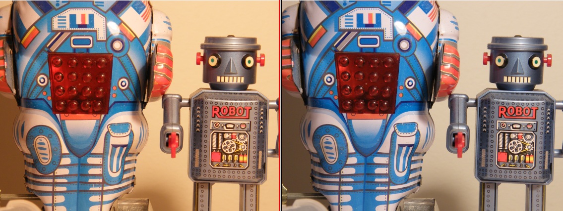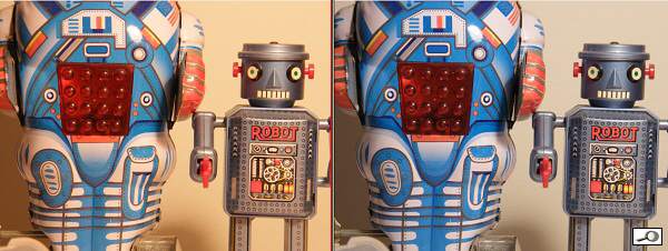Nastavení bílé při žárovkovém osvětlení táhne do červena, ale ne natolik, aby se v případě potřeby snímek nedal upravit i v automatickém režimu. Výrazně lepší jsou výsledky s nastavením “žárovka”, avšak ani tentokrát se nezbavíme nažloutlého nádechu. Je snadné nastavit bílou ručně – pouhou volbou položky a následným stisknutím spouště. Pak ale snímky lehce táhly do modra, takže přirozenější výsledek dal režim “žárovka”. Na ukázce vlevo automatika, vpravo předvolba “žárovka”. Shrnutí Pro a proti:
