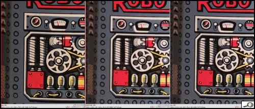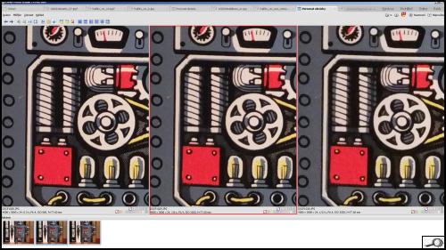 Vyšší hodnoty ISO vyžadují menší rozlišení, přístroj se o to postará sám. Na ukázce jsou tři varianty. Vlevo je výsledek sejmutí a splynutí série fotek (nastavuje se to v režimu ADV, tedy „advanced“), uprostřed běžné nastavení a vpravo EXR režim – vysoké ISO a nízký šum. Tento režim je zřetelně nejlepší v této ukázce, ale hopla, je to 1600 ISO, kdežto konkurenti jsou 5000 ISO. Opravdu si myslím, že EXR je výborný v tom nominálním nastavení, kdy inteligentně volí nastavení podle situace.