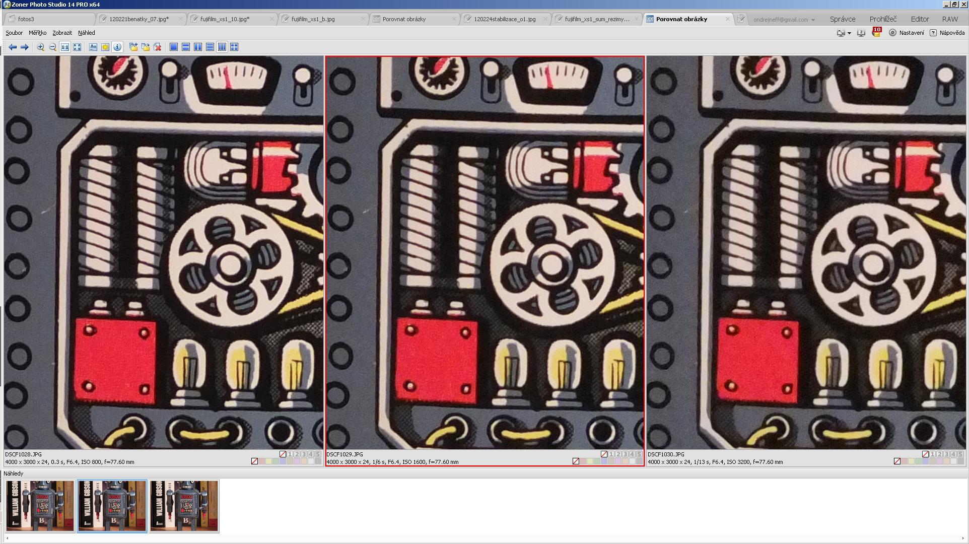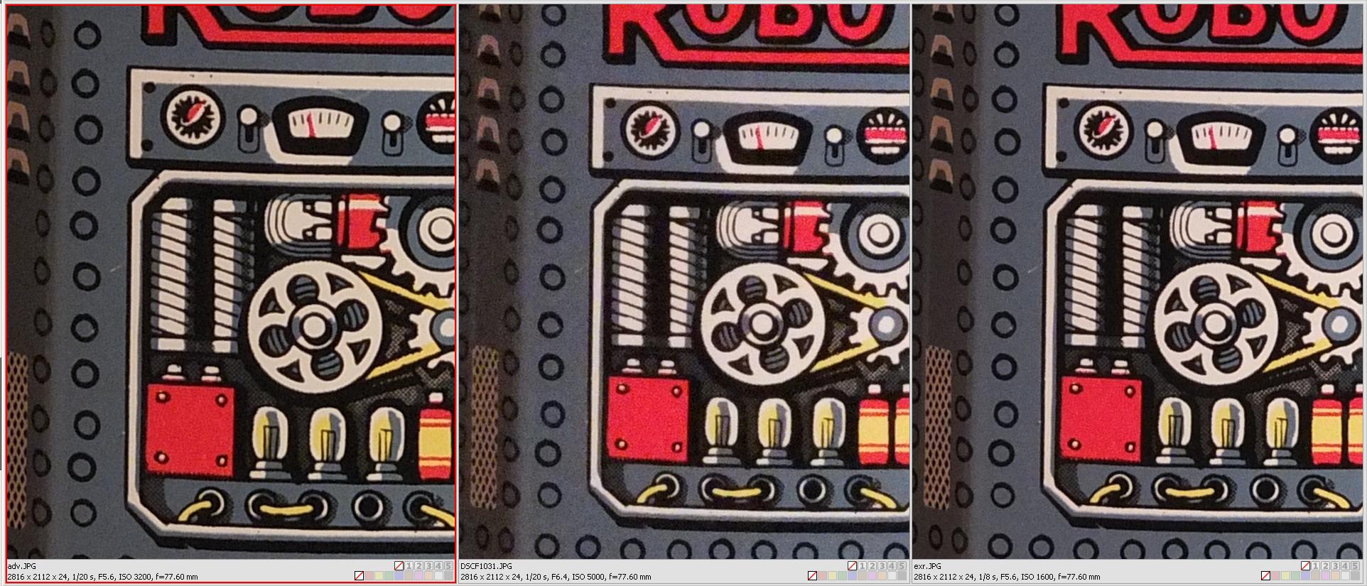 Vyšší hodnoty ISO vyžadují menší rozlišení, přístroj se o to postará sám. Na ukázce jsou tři varianty. Vlevo je výsledek sejmutí a splynutí série fotek (nastavuje se to v režimu ADV, tedy „advanced“), uprostřed běžné nastavení a vpravo EXR režim – vysoké ISO a nízký šum. Tento režim je zřetelně nejlepší v této ukázce, ale hopla, je to 1600 ISO, kdežto konkurenti jsou 5000 ISO. Opravdu si myslím, že EXR je výborný v tom nominálním nastavení, kdy inteligentně volí nastavení podle situace.