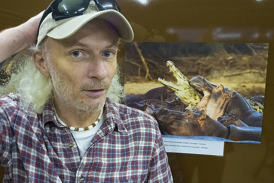 On sám vyhledává ve zvířecí říši akci a tu zachycuje – na výstavě je i snímek, který před lety pořídil šestimegovým Canonem 10D! Zde jsem ho zachytil před jeho zatím nejúspěšnějším záběrem, kdy se mladý krokodýl přřipletl mezi hrochy a ti ho nemilosrdně zlikvidovali.