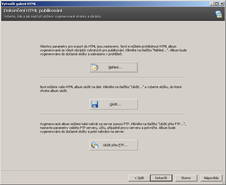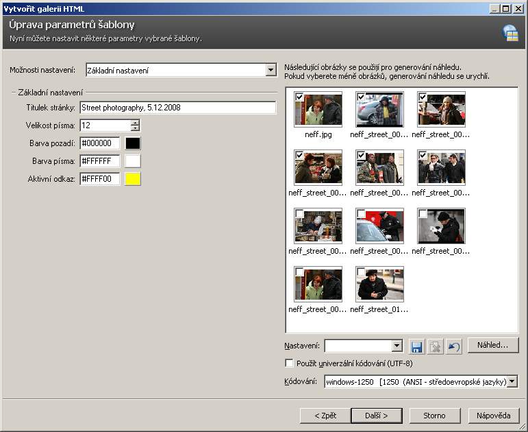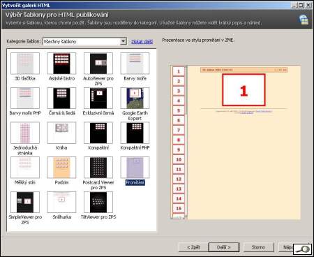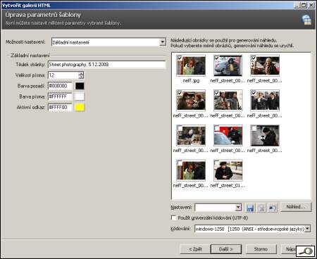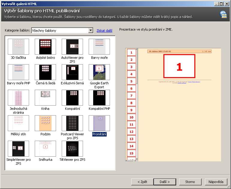 Tak především – co znamená publikování galerie a instalování na server. Příprava Photo Studio nabízí publikování v oddlíle publikovat pod položkou vytvořit galerii HTML. Jakmile jdeme do této volby, zobrazí se následující dialog: ![]() Jak vidíte, je tu nabídka celé řady šablon, tedy připravených podob a aranžmá. Já používám šablonu nazvanou “prezentace ve stylu promítání v ZME (to “ZME” je roztomilé opomenutí Zoneru z doby, kdy se Photo studio jmenovalo Media Explorer 🙂 ). V tomto dialogu se nabízí stažení dalších šablon ze serveru Zoneru, ale je to marná snaha, žádné další šablony tam nenajdete (prosince 2008). Podstatný je ale následující dialog, jemuž je nutno věnovat velkou pozornost. V jeho pravé části vidíme vybrané obrázky. Důležité je okénko “možnosti nastavení”. ![]() Pod položkou náhledy nastavíme umístění náhledového okna (nechává ho vlevo) a velikost náhledových obrázků. Položka Obrázky definuje velikost a kompresi obrázků (publikační proces převzorkuje obrázky na standardní velikost). To všechno je jednoduché. Teď přijde to méně jednoduché. Nadpis je to, co se objeví na všech stránkách v galerii. Můžete to tam napsat ručně, ale lze i sem už něco vložit z EXIF. Já to dělám ručně a EXIF si nechávám na další položku. Popisek je ta důležitá položka. Zde je ukázka: Clona {F#S:", "} doba osvitu {ET#S:", "} ISO {ISO#S:", "} ohnisko (ekv.) {CAM_FOCALLENGTH35MM#S:" "}