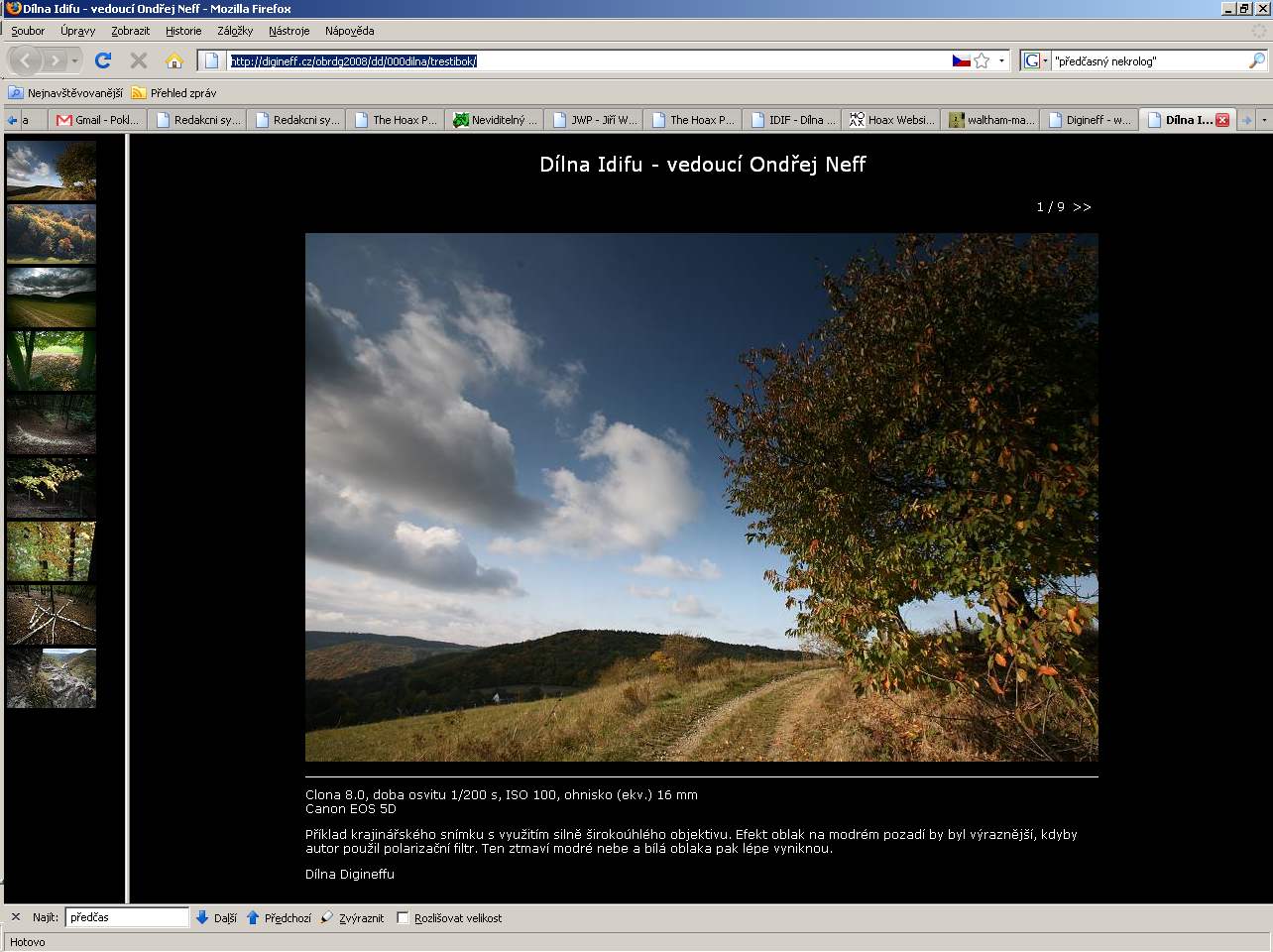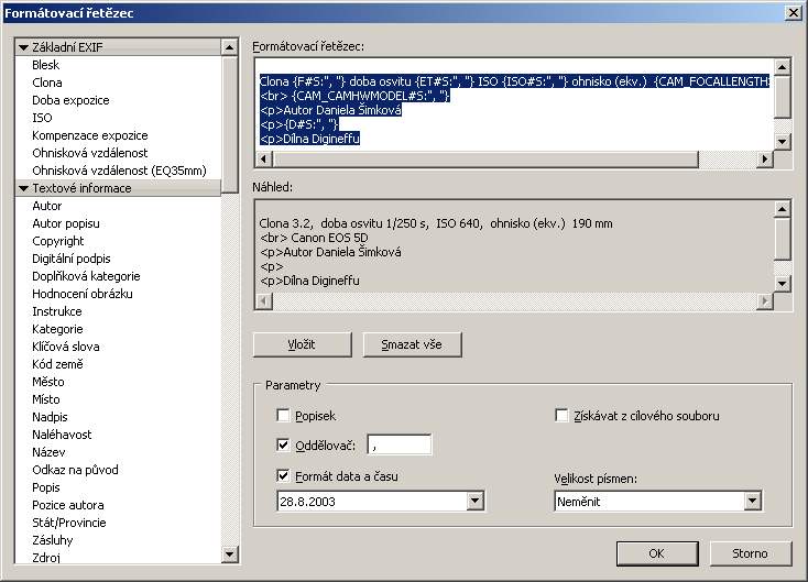 ![]() Ty proměnné typu “clona”, “doba osvitu” atd. se vkládají v dialogu formátovací řetězec. Nic složitého na tom není. Vlevo volíte, co chcete mít pod fotkou, tlačítkem vložit to vložíte a nahoře máte náhled, jak to vypadá. Tady můžete zadat i popis – a dostanete do stránky vše, co jste si napsali v režimu “slide show”, jak je to popsáno nahoře. Pokud chcete, můžete pod popis dát ještě zápatí, což je další textový blok podle vaší volby. Já ho do galerie nedávám, ale lze to. Užiteční je uložit si nastavení pod specifickým jménem (ikonka diskety vpravo). V poslední fázi si lze výsledek prohlédnout (náhled), nebo uložit (pozor na volbu správného adresáře, nejlépe je ukládat tam, kde máme připravené vybrané fotky) anebo rovnou poslat přes FTP na server. ![]() Taková galerie pak vypadá asi takto – jde o ukázku komentované galerie pro Dílnu. ![]() Na první pohled to vypadá divoce, ve skutečnosti je to jednoduché a velmi praktické. Vřele doporučuji vyzkoušet – a lze samozřejmě experimentovat s jinými šablonami než je tato. ZPS nabízí i šablonu ve flashi, vypadá dobře, někdy se na ni taky podíváme. |