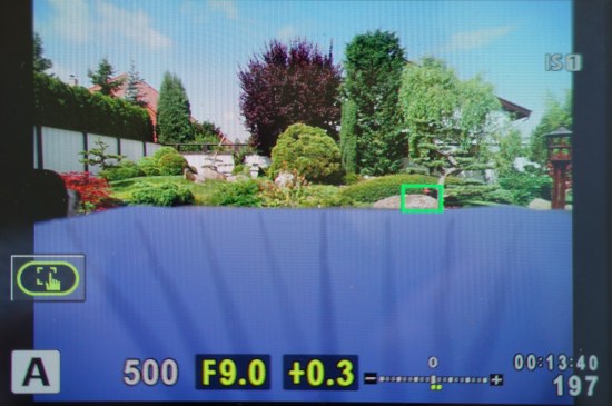 Uzlový bod objektivu nastaveného na 12 mm (ekv. 24 mm) je nalezen. Všimněte si, že je blízko vstupní čočky. Tento “no paralax point” se používá při pořizování panoramat z dílčích snímků. Objektivy panoramatických aparátů typu Horizont se otáčejí kolem uzlového bodu – kolem optické osy otáčení.