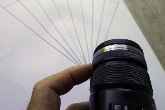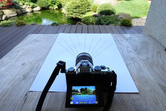Nemaje kružítka ani pravítka jsem v sobotu improvizoval, ale i tak jsem uzlový bod objektivu Olympus Zuiko 12-50 mm při ohnisku 12 velmi snadno nalezl. Postup se snáze ukáže na obrázcích. Svého Olympuse OM-D EM-5 jsem položil na neumělý výkres: