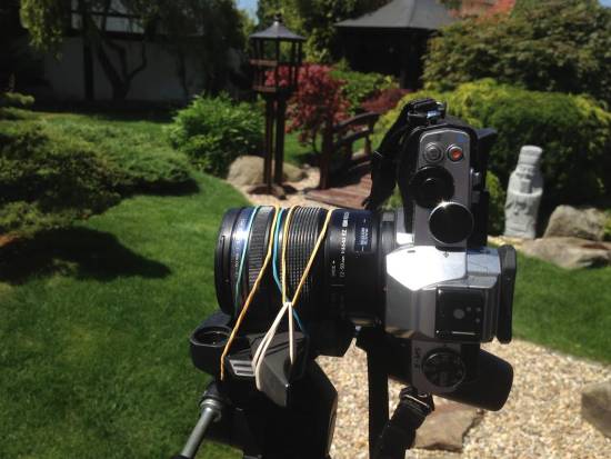 Co dál? Pochopitelně, že nejlepší by byl Nodal Ninja, tedy speciální nástavec na stativ, dá se u nás koupit v cenách od pěti do deseti (a víc) tisíc. Pro účely článku jsem zaimprovizoval gumičkového ninžu. Z obrázku je patrné, kde uzlový bod leží: