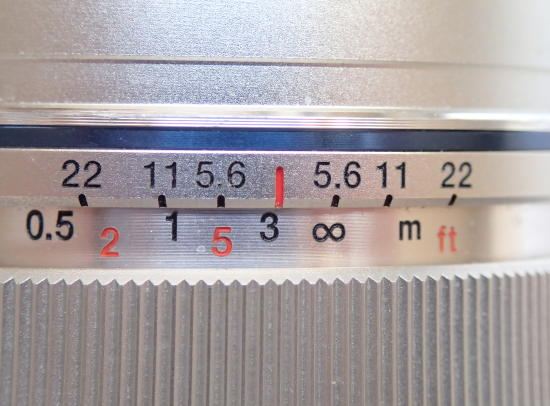 Dejme tomu, že je zacloněno na F 5.6. Svislá červená čárka je ryska pro manuální ostření (u tohoto objektivu je to duchaplně zařízeno tak, že přesunem prstence dolů odkryjeme tuto stupnici a přepneme na ruční ostření). Označení 5.6 vpravo lícuje s nekonečnem, vlevo někde mezi 1.5 a 2 m, těžko se to odhaduje. Ryska je někde za třemi metry a to je hyperfokální vzdálenost. Ta se pochopitelně mění s každou konkrétní hodnotou clony, proto je těžké u přístrojů s malými velkými čipy nějaký takový knoflíček implementovat. Nicméně některé kompakty něco podobného mají, jmenuje se to vždycky nějak jako rychlé ostření a ve skutečnosti je to manuál na hyperfokální vzdálenosti. Pokud jde o software schopný skládat snímky ostřené na různé vzdálenosti, ty samozřejmě existují a umí to i Photoshop. Není to ale zcela triviální záležitost. Prakticky jde o vymaskování neostrých partií a složení a prolnutí ostrých partií. Problém ale je v tom, že přeostření vede i ke změně velikosti zobrazených objektů a pak jsou ty potíže s pasováním. Teoreticky je to jednoduché, praxe je složitější. Kdyby to tak nebylo, byly by tyhle softwary všude…. byly by implementované do fotoaparátů, jako je v nich dnes HDR.