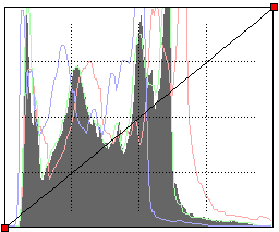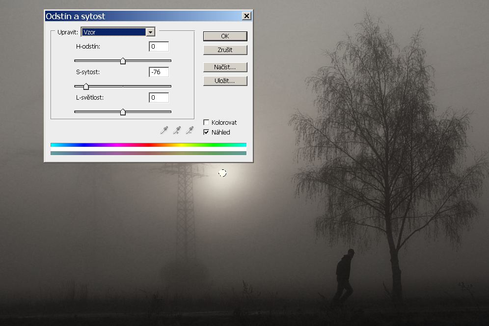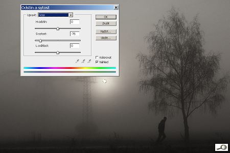 Šedě vyplněný graf ukazuje celkové jasy. Začíná vpravo nedaleko od bílé, a pak jsou jasy rozloženy v několika “vlnách” až do hodně temných, avšak nikoli černých. Červená linka ukazuje, že červený kanál je tu nejvýraznější, kdežto naopak modrý je utlačený – však je ten obrázek hodně načervenalý. Čistě teoreticky by bylo možné úpravou kanálů, jednoho po druhém, barvu vyladit. Žádoucího výsledku ale lze dosáhnout jednodušším způsobem – snížením sytosti barev, tedy desaturací. Tímto zásahem se zmenšuje odstup jednotlivých kanálů – pokud bychom desaturovali až na maximum, získali bychom černobílý snímek. Tam až nechceme jít. Nerad bych přišel o charakter jemně zbarveného snímku. Takže asi takto: