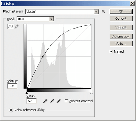 Nyní je třeba upravit jas snímku. Otevřeme si křivky a nastavíme křivku v první čtvrtině asi takto: