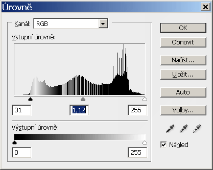 Jenže tím jsme přišli o temné tóny. Ty ale snadno získáme zásahem do úrovní – posunutím černého bodu doprava (na ukázce je to na úroveň 31). Celkovou tonalitu můžeme upravit i jezdcem pro střední šedou, nastavením o něco doleva jsme střední tóny poněkud zesvětlili, takže se mha ještě projasnila. Sluneční kotouč však zůstal nedotčený, jasně ohraničený.