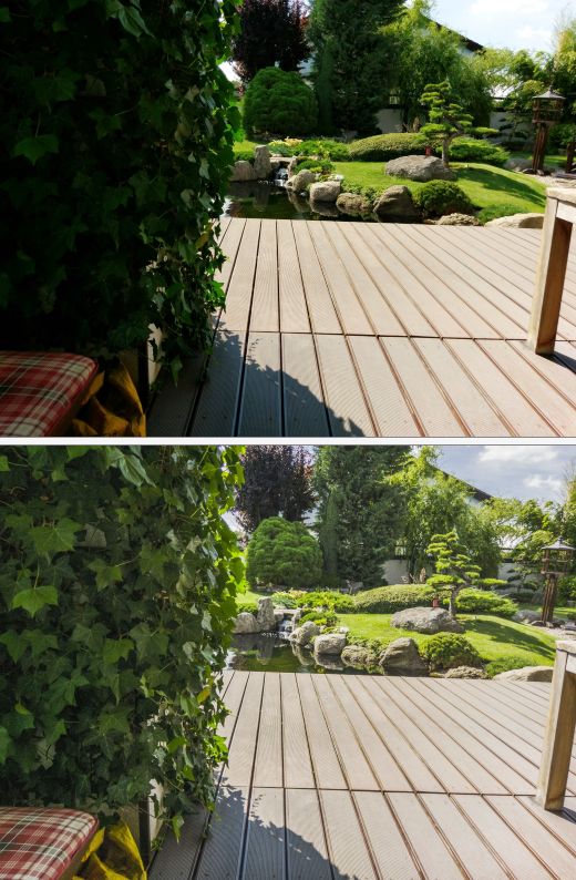 Všimněte si mraků vlevo, o co jsou ve zpracovaném obrázku víc prokreslené. Tady zase je vidět rozdíl v podání stínů – nahoře původní JPEG, dole vyvoláno z RAW.