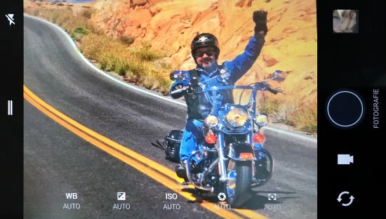 Režim PRO je fakticky režim Program běžných fotoaparátů. Lze v něm nastavit bílou, korekci expozice, ISO, expoziční dobu a lze ručně nastavit vzdálenost (= ruční ostření). Mobily, tedy ani tento, nenabízejí ovládání clony. Vypadá to pak následovně (ikonka vlevo nahoře znamená, že je zakázaný blesk):