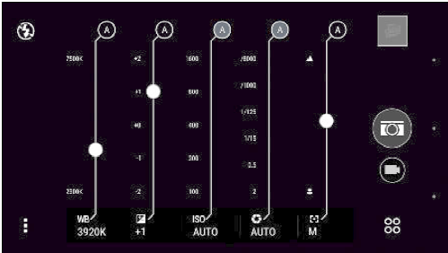 Pokud v režimu foto klepneme na ikonu fotoaparátu, objeví se nám něco, co připomíná scénické režimy. Je to noční snímek, HDR (používá se k vyrovnání jasů, ještě se o tom zmíním), ruční režim – ten má následující táhla: