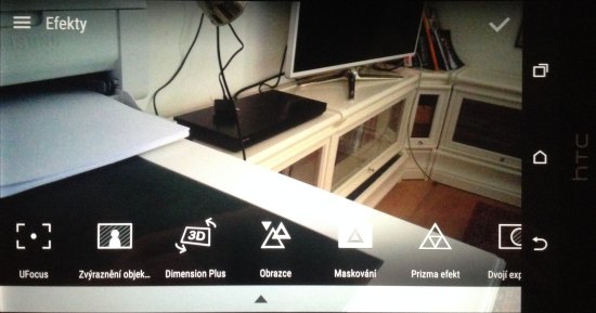 Z našeho hlediska je zajímavý duální objektiv. Objevil se už na modelu HTC One M8. Objektivy jsou na zadní stěně mobilu dva. Ten funkční patří dvacetimegovému aparátu a ten nad ním v podstatě neslouží k zachycení obrázku. Zajišťuje stereoskopické vnímání, takže přístroj vnímá prostorovou hloubku fotografované situace. Podle HTC to velmi urychluje proces ostření. Druhý benefit se projeví při editaci, kdy je možno zvolit v obraze objekt, který má být ostrý a to co je mimo jeho rovinu rozostřit.