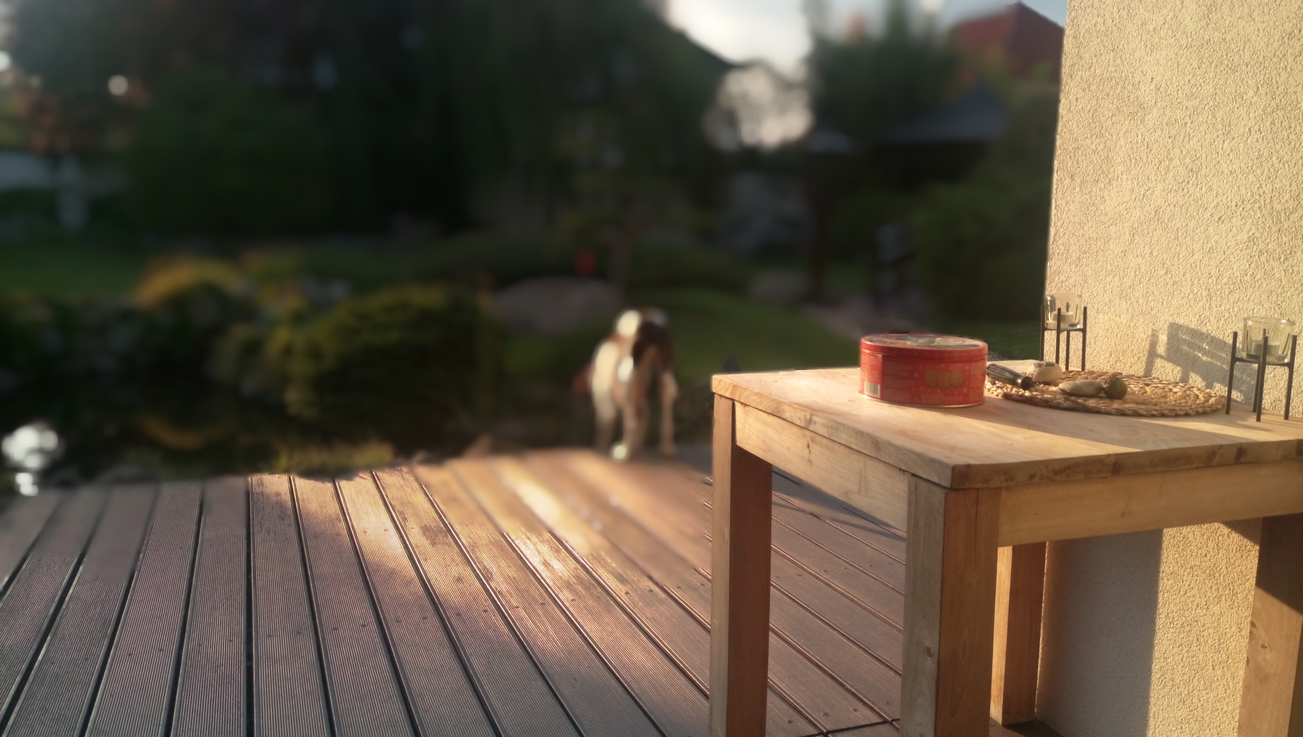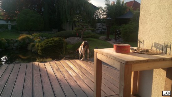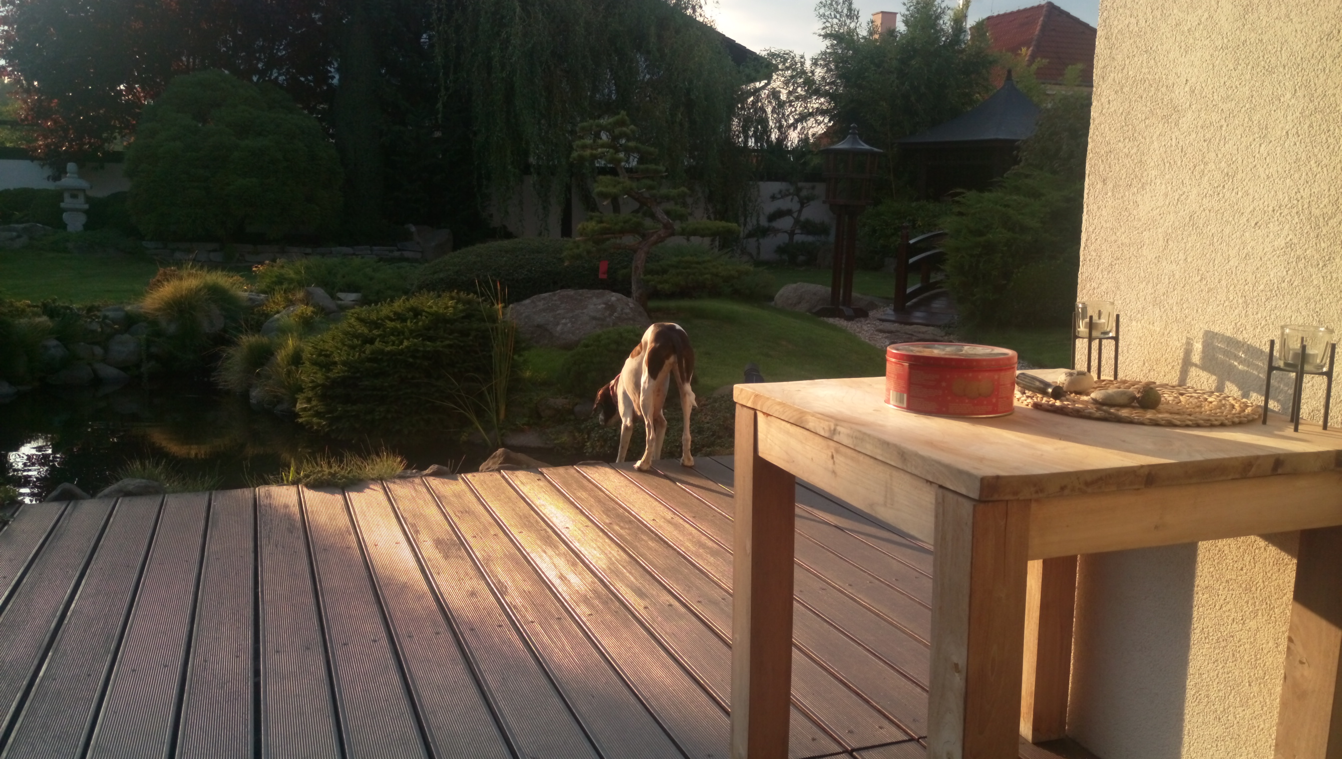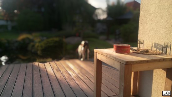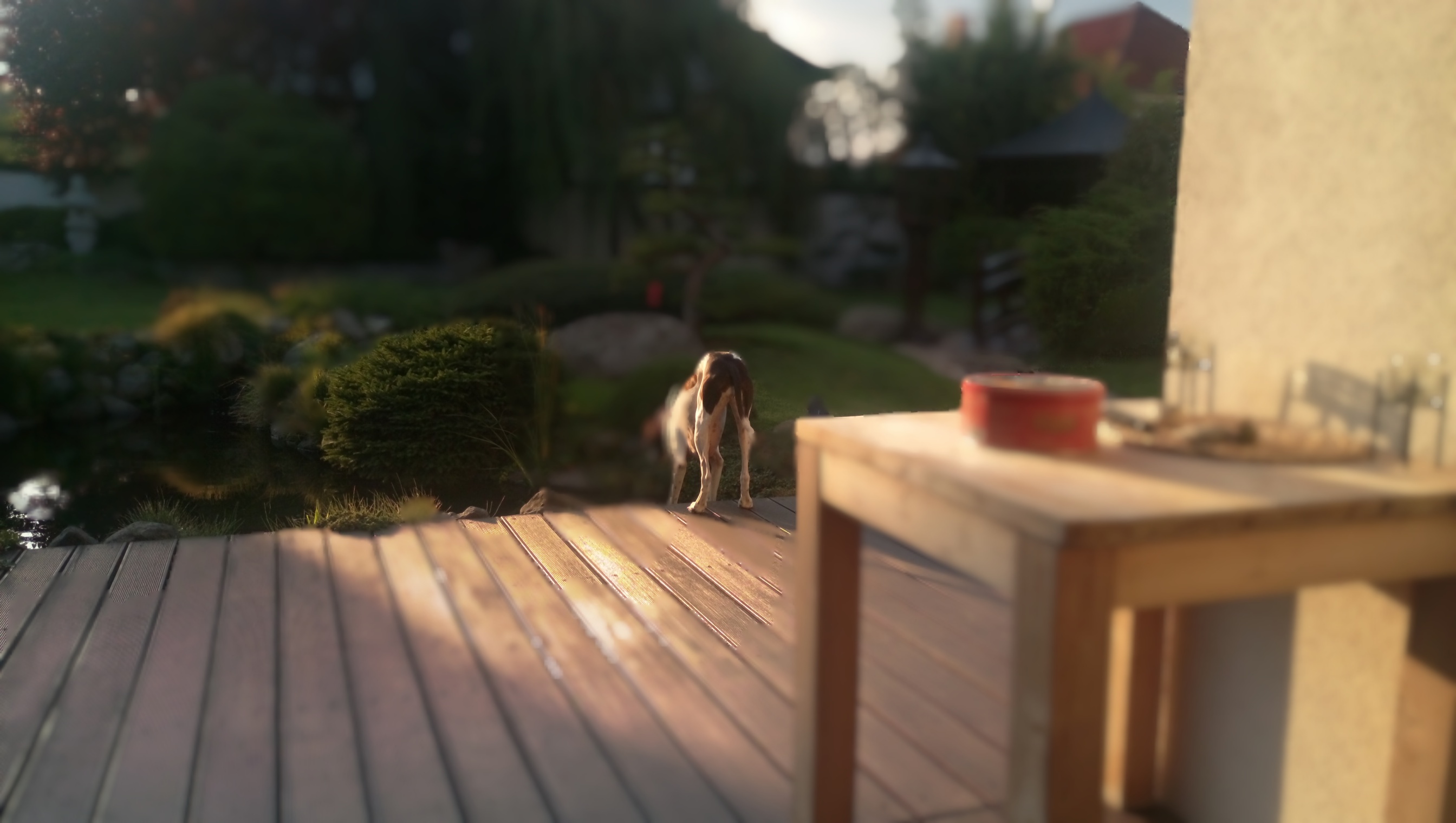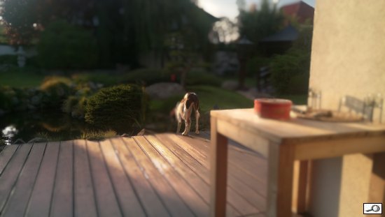Když ji aktivujeme, je možno klepnutím na místo na snímku určit, co má být ostré a zbytek se rozostří. Míru rozostření lze ovlivňovat táhlem od + do – . Poté se obrázek uloží, avšak původní zůstává. Můžeme tedy získat dva obrázky s jinou rovinou ostrosti. Ukázeme si to na příkladu. Vyfotil jsem naši Noru jak pije z jezírka a bral jsem ji přes stůl – je dobré mít scénu výrazně prostorově členitou. Ten obrázek Duo Cam je ovšem menší, 2688 x 1520, tedy čtyřmegový: