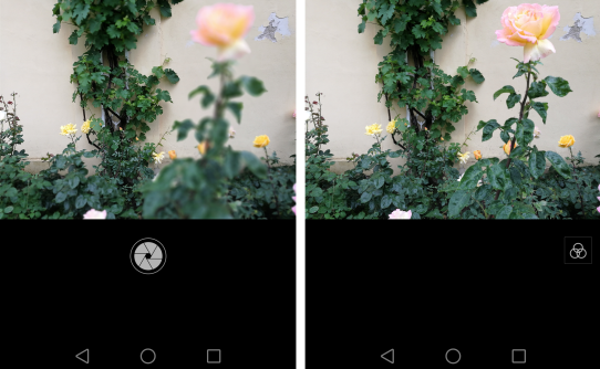 Když se začne psát o ovládání mobilu, logicky se píše o fotoaparátu, který je v základní nabídce – pro Android existují stovky rozmanitých aplikací typu fotoaparát. Hovořme tedy o tom základním a zde musím připustit, že jsem neviděl tak dobře vyřešené ovládání na tak vysoké úrovni. Ve výchozím nastavení je to samozřejmě naprostý automat s možností volby selfíčko, video – a také zde najdeme tu podivuhodnou manipulaci s ostrostí. Dostaneme se do toho přes ikonu v podobě clony a pak manipulací táhlem na displeji je možno měnit rovinu ostření a ovlivňovat míru rozostření. Vlevo je částečné vykrytí, vpravo proostření: