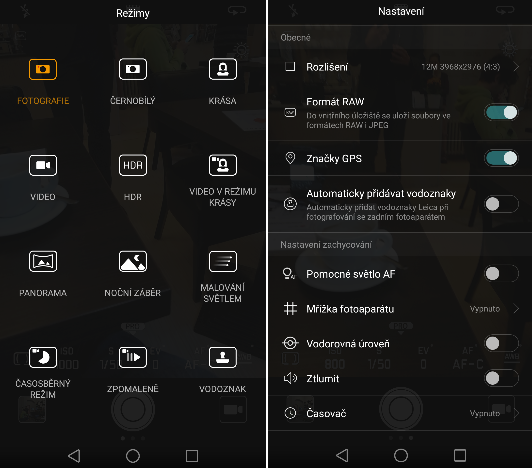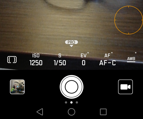 Podstatná nabídka se ale skrývá na spodní části obrazovky – je to režim Pro, kde najdete to, co je potřebné: režim měření expozice (zóny a bodové) ISO, čas, korekce expozice, ostření jednorázové, průběžné nebo ruční a nastavení bílé. V tomto režimu Pro nelze ale čarovat s clonou – k tomu ovšem podotknu, že je to zcela normální, nepamatuju, že bych měl v ruce fotomobil s možností clonit. Toho se používá ke kontrole hloubky ostrosti, jak je všeobecně známo. Zde ale dosahujeme efektu separační clony speciální funkcí, popsanou výše. V režimu PRO ale nelze tuto funkci použít. Z režimu PRO do standardního režimu se dostaneme tak, že stáhneme ikonku PRO dolů a je pokoj.