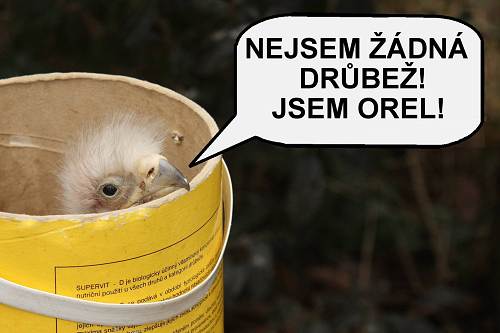 Někdy chceme obrázek doplnit textem. Už jsme si tu ukazovali, jak si lze vytvořit novoročenku, dnes se podívejme na comicsovou bublinu. Je mnoho způsobů jak to udělat, ukažme si aspoň některé. Tuhle fotku jsem pořídil v ZOO. V krabici od krmení pro drůbež dřepí orlí kuře, sotva vylíhlé, skoro ještě se skořápkou na zadečku. Text se nabízí: NEJSEM ŽÁDNÁ DRŮBEŽ! JSEM OREL! Vytvořme tedy bublinu a text do ní vložme.