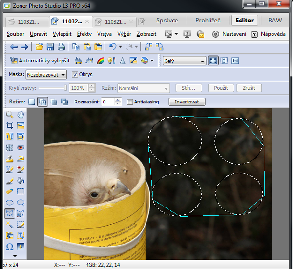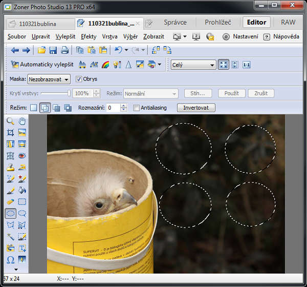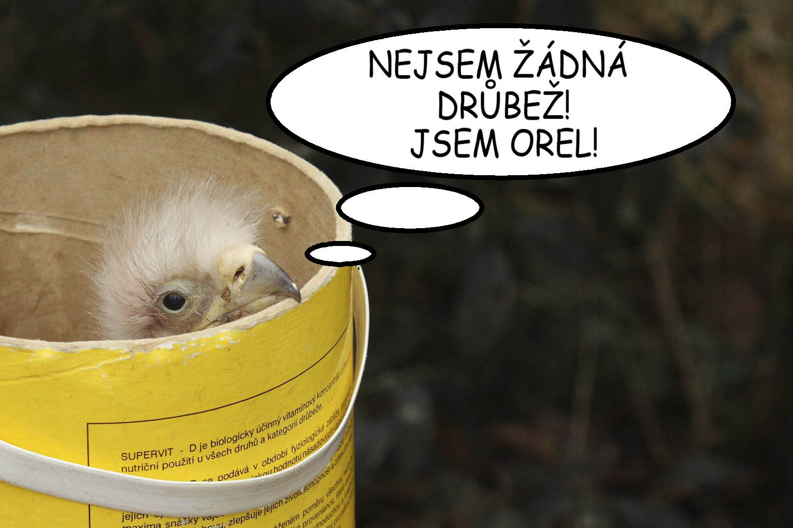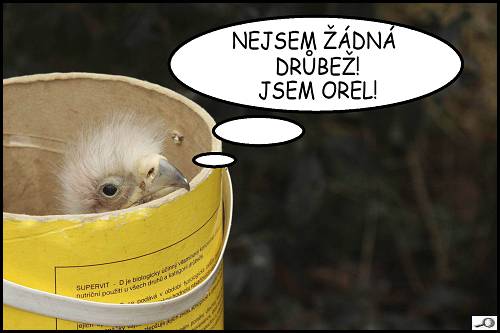 Někdy chceme obrázek doplnit textem. Už jsme si tu ukazovali, jak si lze vytvořit novoročenku, dnes se podívejme na comicsovou bublinu. Je mnoho způsobů jak to udělat, ukažme si aspoň některé. Tuhle fotku jsem pořídil v ZOO. V krabici od krmení pro drůbež dřepí orlí kuře, sotva vylíhlé, skoro ještě se skořápkou na zadečku. Text se nabízí: NEJSEM ŽÁDNÁ DRŮBEŽ! JSEM OREL! Vytvořme tedy bublinu a text do ní vložme.