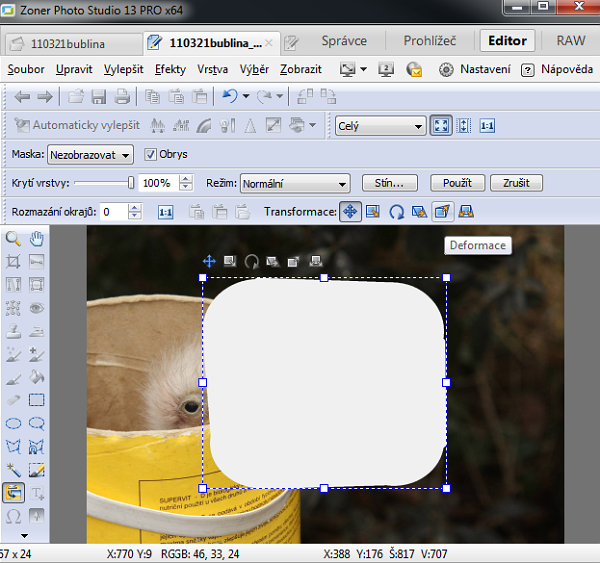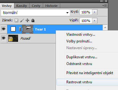 To vložíme do obrázku a natahujeme tak, aby velikostí vyhovovala. Doladit to lze příkazem Ctrl + T, tedy transformací, jako to děláme v jakémkoli běžném výběru. Bublina se objeví v nabídce vrstev jako tvar, ten samozřejmě lze rastrovat, tedy převést na běžnou bitmapu, běžnou vrstvu.
