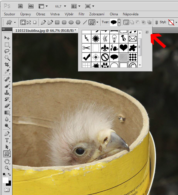 V Photoshpopu si najdeme v nabídce nástroj jiný tvar a pak už je to hračka. Zvolíme bublinu a pak klepneme na šipku vpravo nahoře – a získáme nabídku hafo různých typů bublin.