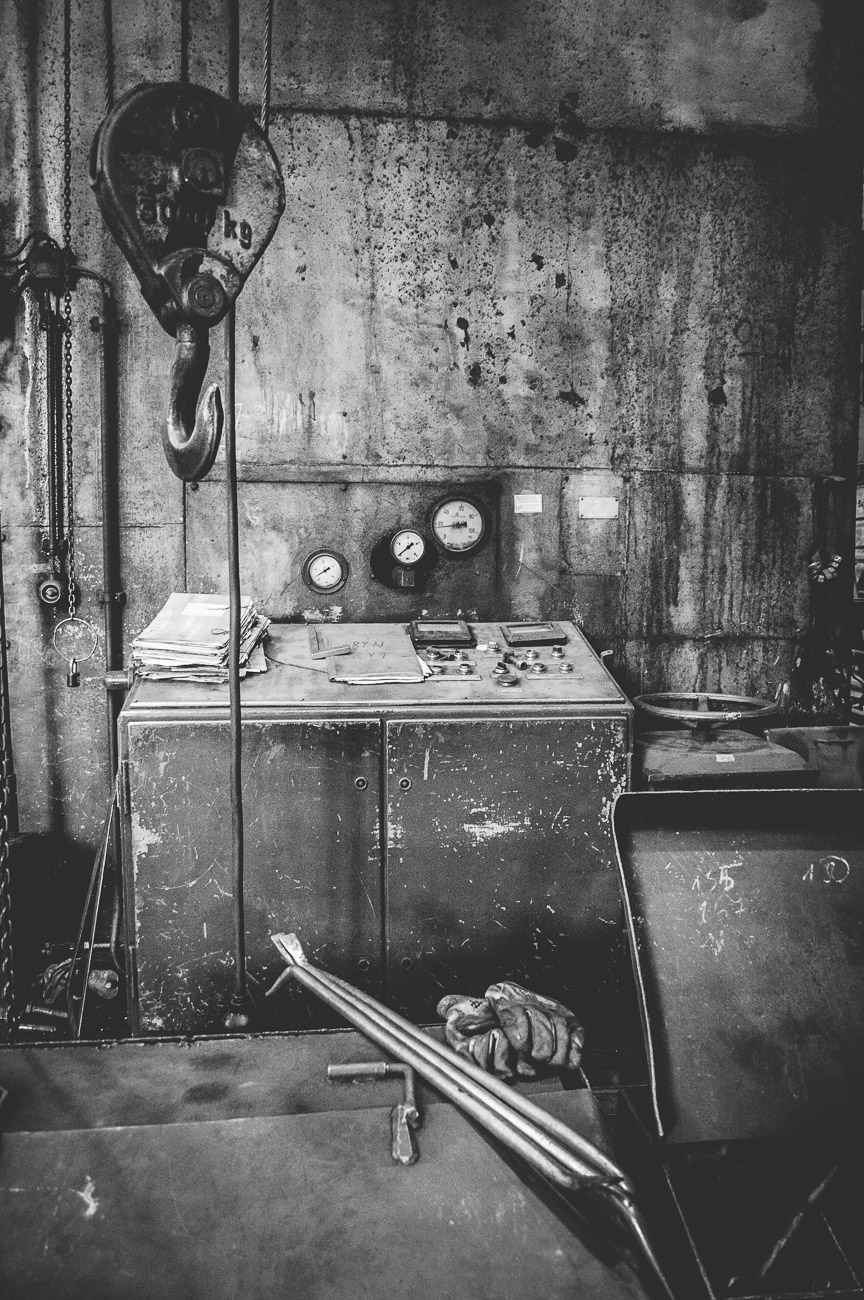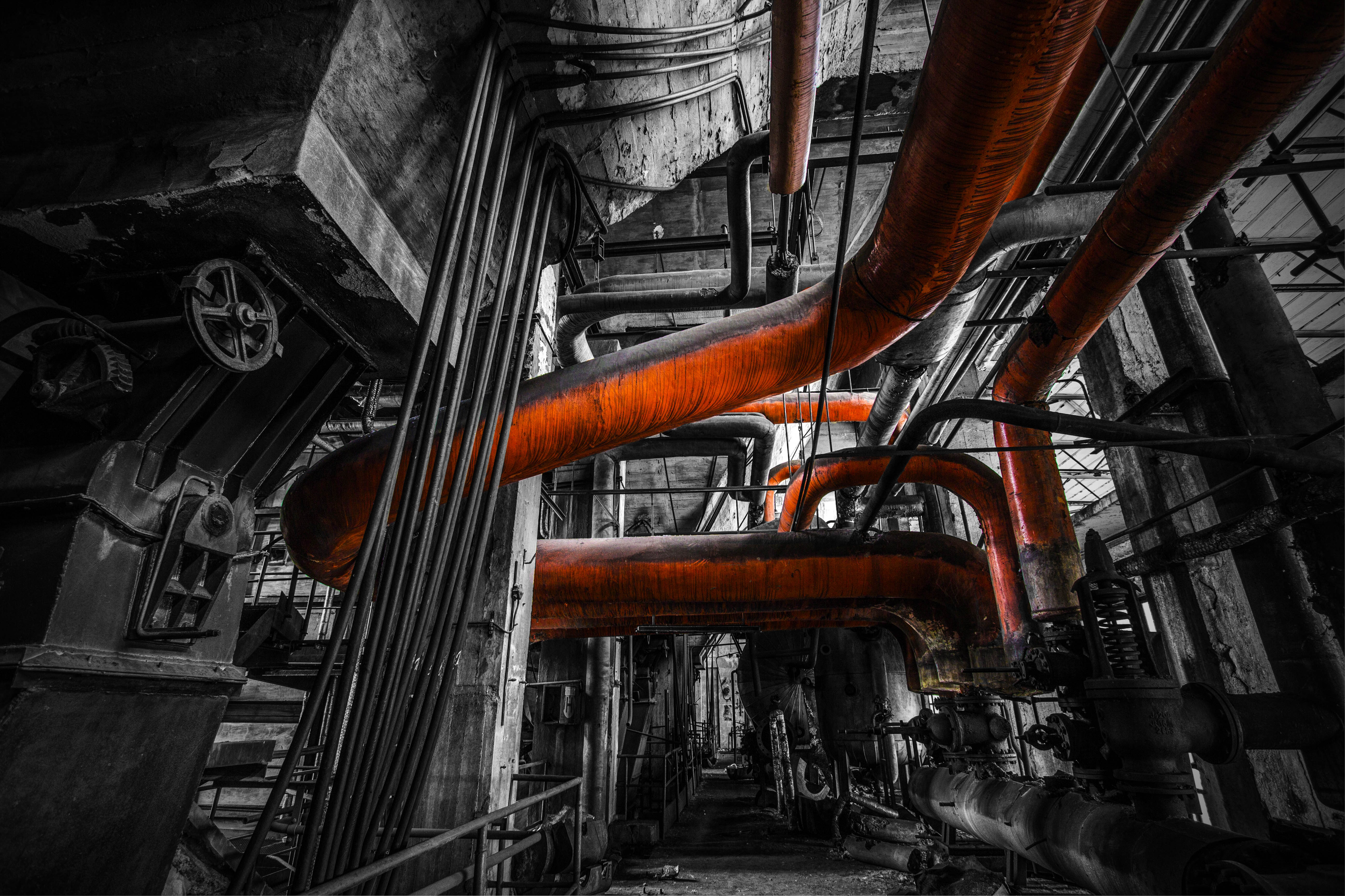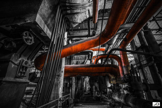 Industriální peklo Kateřiny Havlíkové už nese stopy editační laborace. Abychom se ve fotce vyznali, je sem vnesen prvek parciální barevnosti – z černobílé fotky svítí červené roury. Zde je to experiment rozhodně nikoli samoúčelný.