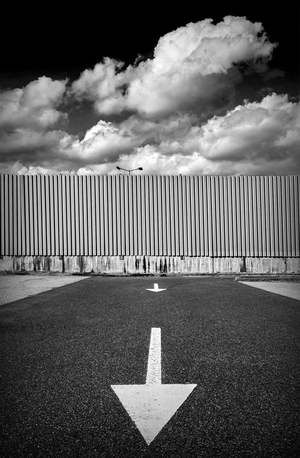 Výrazná černobílá fotka. Grafické markanty na asfaltu nás doslova přikovají na místo a za ohradou, snad za zdí, vyčuhuje lampa pouličního osvětlení. Bohaté mraky se rýsují proti černému nebi – v klasické černobílé fotografii se toho dosahovalo červeným filtrem, dnes toho lze dosáhnout správným nastavením kanálů – anebo samozřejmě také filtrací v editoru. Svým pojetím stojí tato fotka jaksi úplně jinde než ta předchozí.