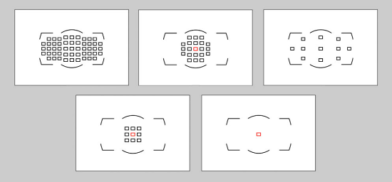 Výběr AF bodu Principiálně jsou dva způsoby výběru. Je to aktivace všech AF bodů anebo volba jednoho zaostřovacího bodu.