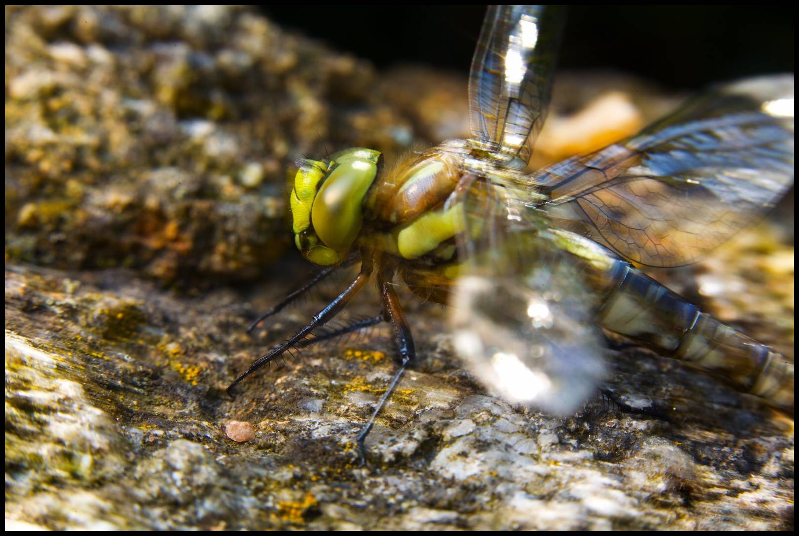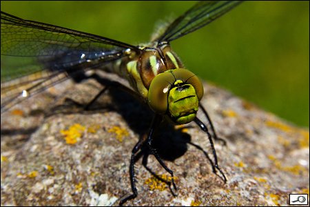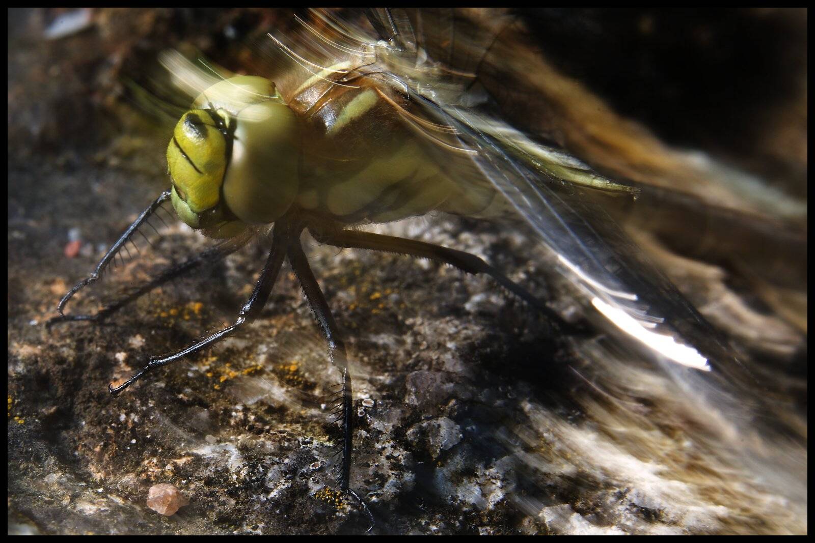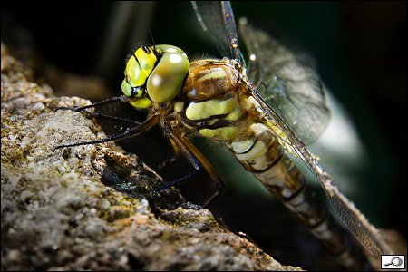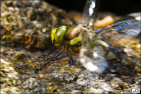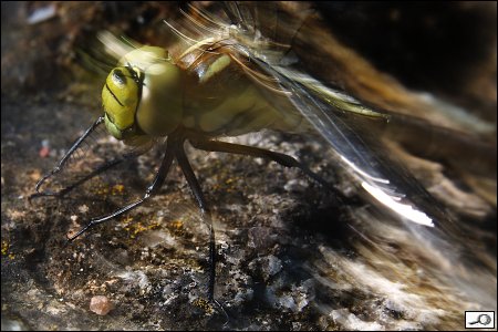 No, dejme tomu, dobrý. Jenže pak jsem si vybavil zkušenosti z nedávného focení motýlů ve Fata morganě a aktivoval jsem externí blesk Speedlite 430EX II se sofboxem LumiQuest a infra dálkovým ovládáním. Zdálo se mi, že to na těch 400 ISO trochu šumí i na tom sluníčku, takže jsem se rozhodl pokračovat s tím bleskem. Postavil jsem ho na kámen proti vážce a fotil jsem z boku, takže osa objektivu a směr blesku byly k sobě cca 90 stupňů. Dobrý, ale křídla se té vážce strašně leskla: