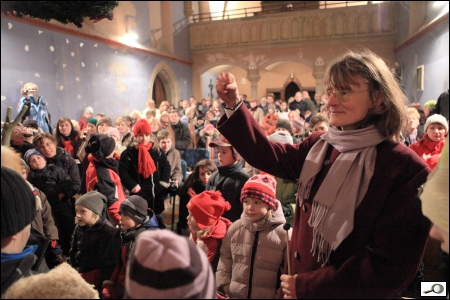 Nastavení bílé – ono je totiž třeba brát v úvahu, co je správné nastavení bílé: takové, kdy se nám bílé objekty a taky šedivé zobrazí na snímku jako bílé a šedivé. Nic jiného to není. Jenže jsou situace, kdy nám tohle “správné zobrazení” nemusí dělat radost. V tom kostele například hoří svíčky a je tam vánoční atmosféra – po zkušenostech od vánočního stromečku jsem tedy nechal WB v automatickém režimu. Zpívání mohlo pomalu začít, paní učitelka Netopilová (dole na snímku) už dala poslední pokyny. No a bylo nutno přitvrdit s citlivostí…