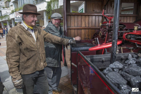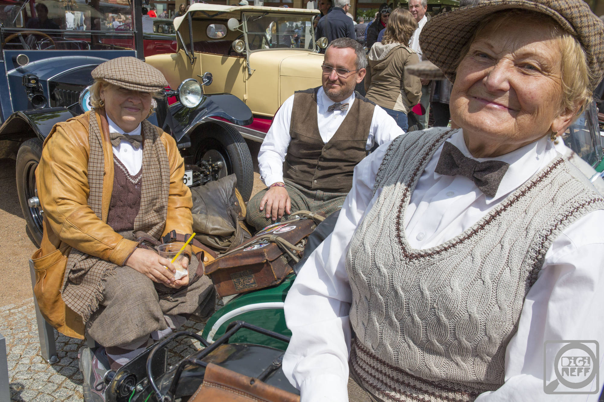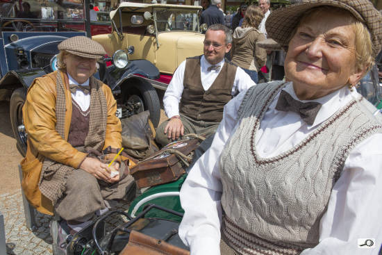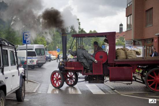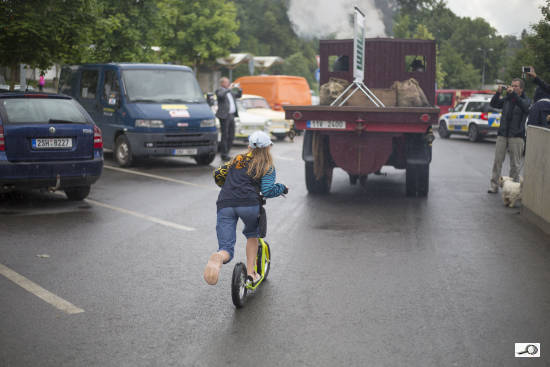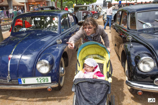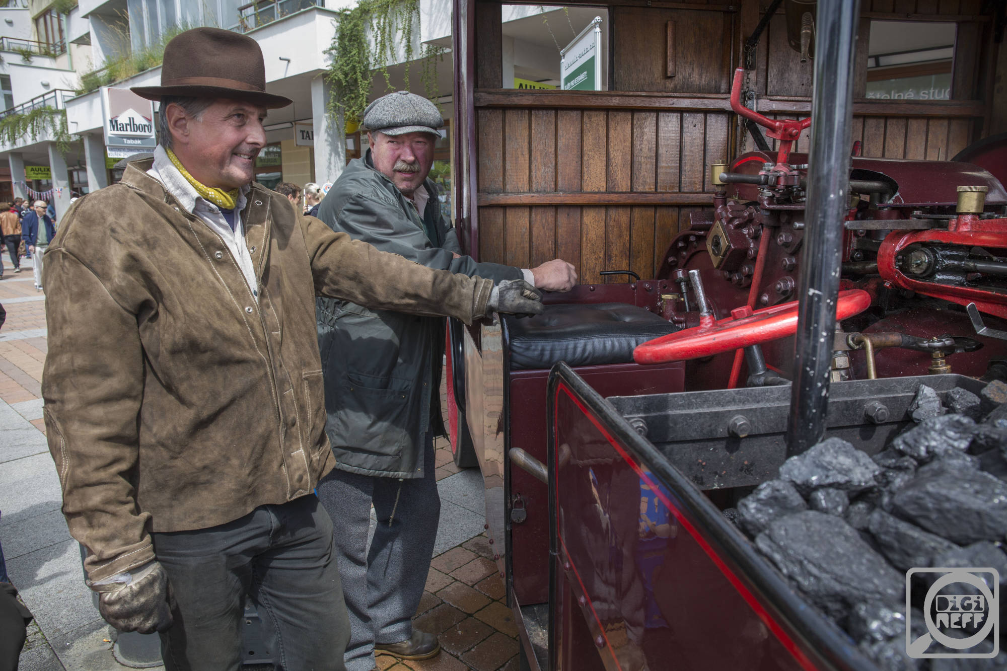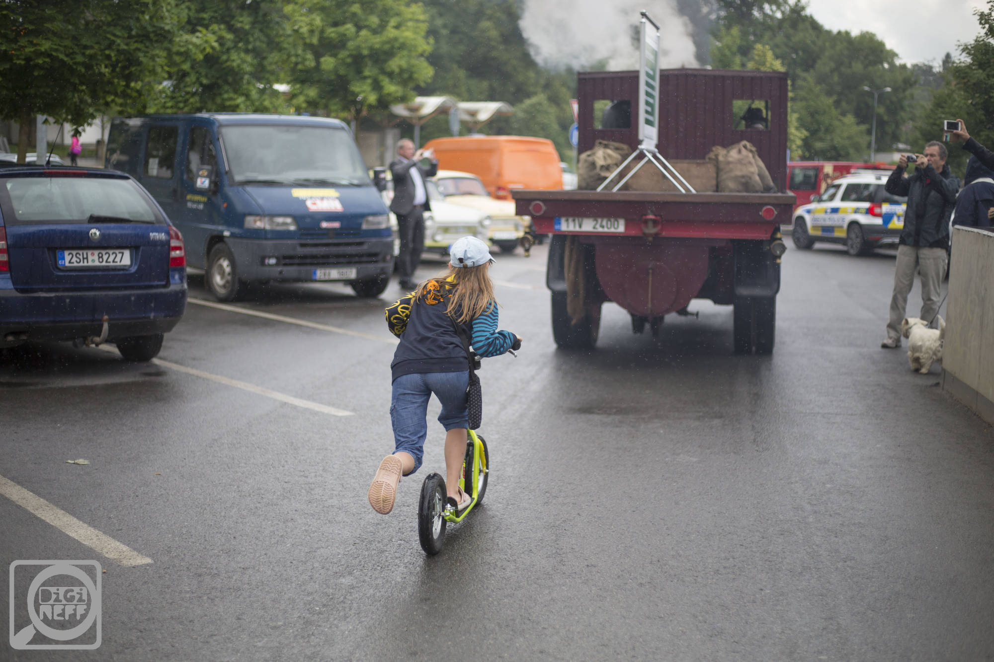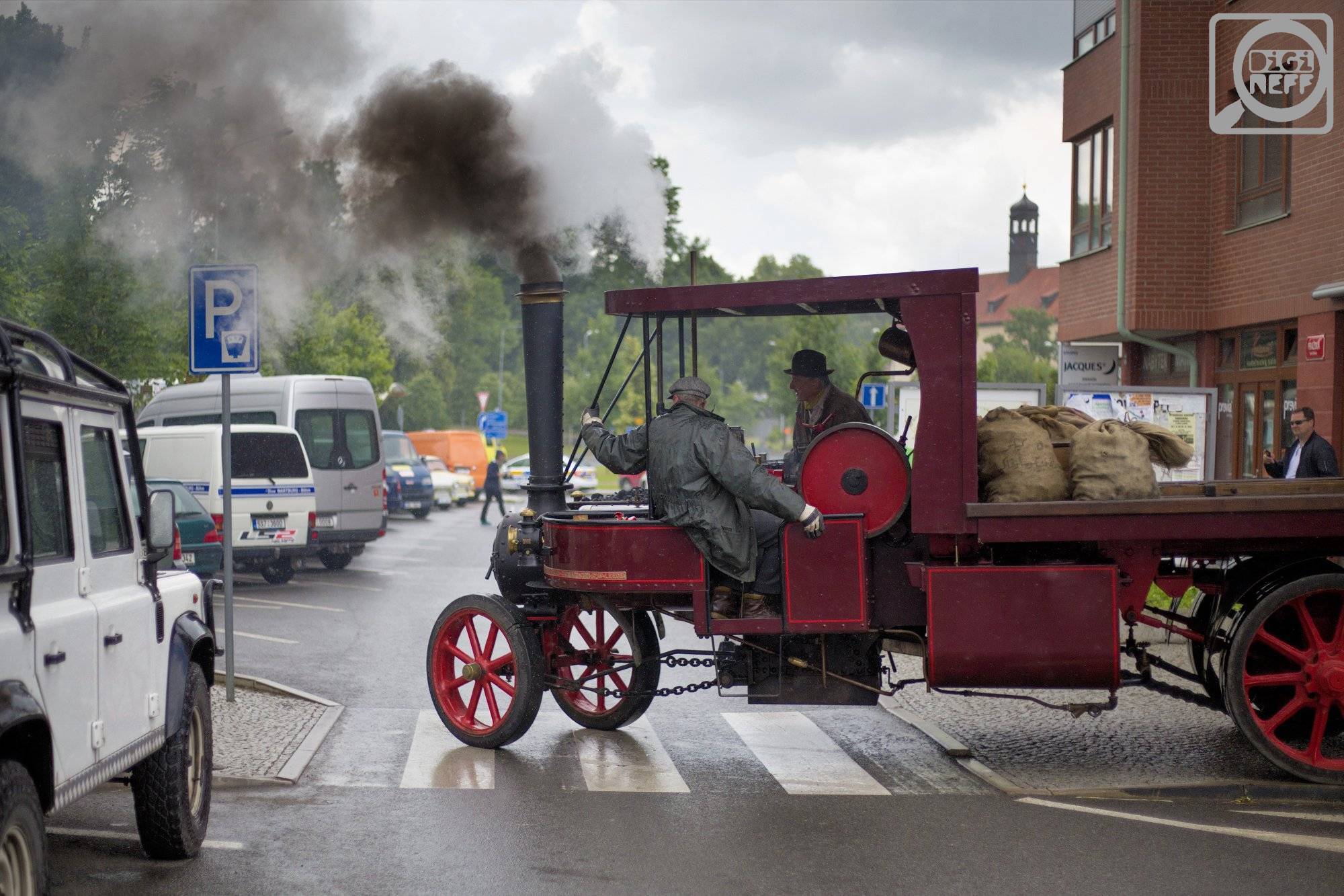 Letos byl velkou atrakcí parní automobil Mann z roku 1914. Dovezl ho do Břežan ing. Stárek, tvůrce Muzea užitkové techniky v Mníšku u Prahy. Zde vidíme vozidlo vyjíždět na krátkou, ale hodně napínavou jízdu do nejbližšího okolí – před vozem kráčí (mladý muž) s praporem, aby varoval ostatní účastníky dopravy – ejhle, v roce 2015 vidím poprvé aplikaci klasického praporkového zákona; ostatně vidím poprvé v životě jet parní automobil, pokud nebudu počítat parní válce z doby mého dětství. Všimněte si malé hloubky ostrosti: je to foceno objektivem Canon 50/1.8 STM, jeho recenzi chystám. Na plnoformátovém Canonu se tahle padesátka chová jako klasická základní objektiv s úhlem záběru cca 45 stupňů. Malá clona má úžasný separační efekt: v hustém dešti se obluda krásně vyloupla na rozmlženém pozadí.