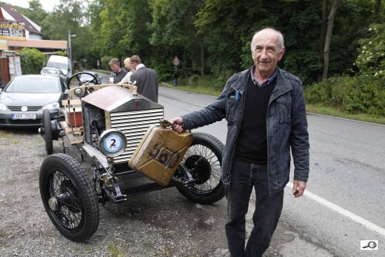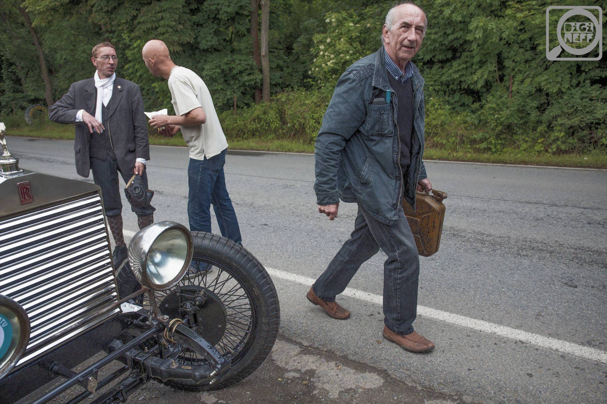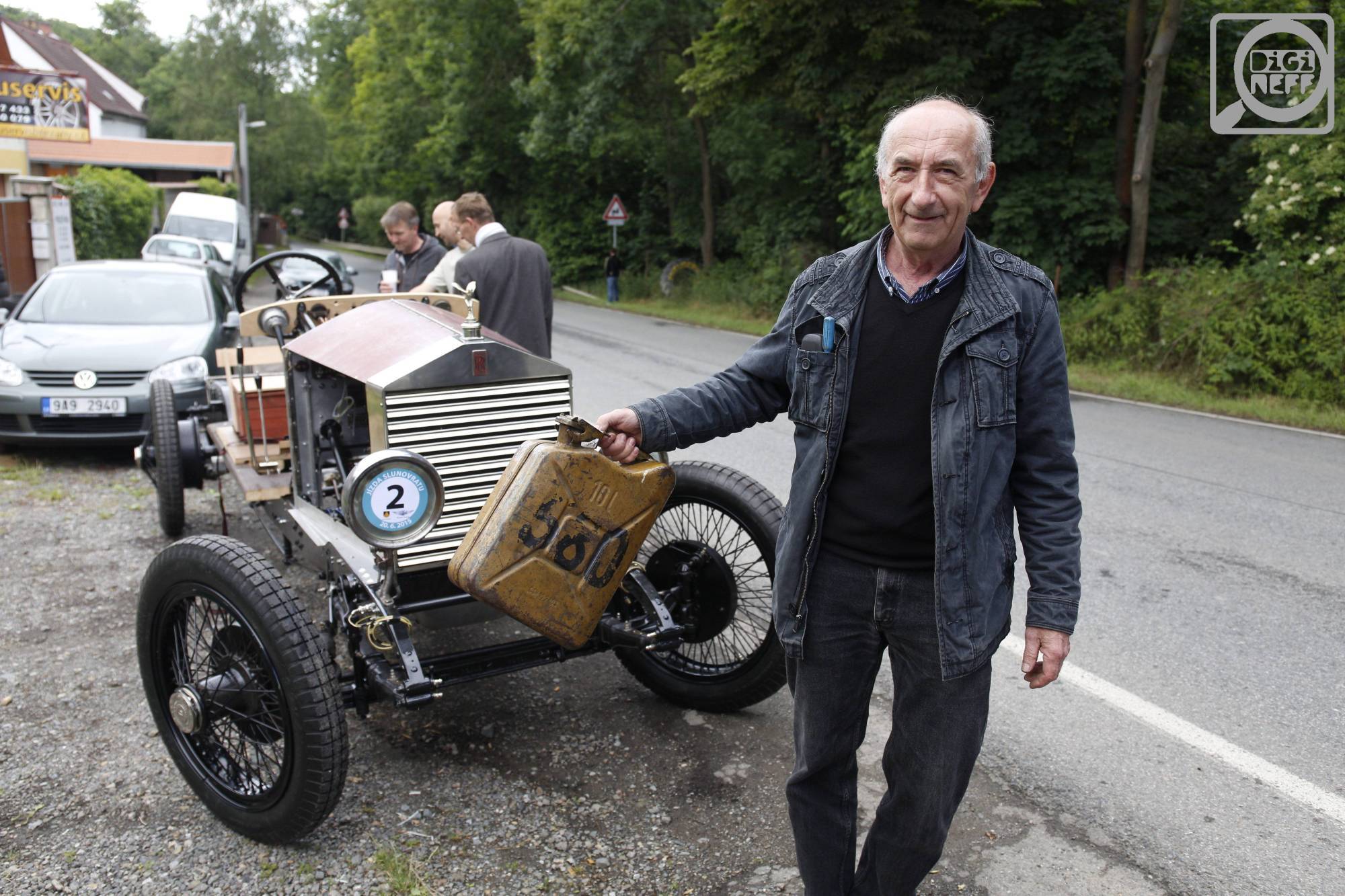 Zde je pan Brábník, renovátor, a jeho stroj. Jde o Rolls Royce ve stavu individuální výroby karosérie, jak se to dělávalo dřív, když Sodomka oblékal bugattky manželům Junkovým. Došel benzín, protože ještě nedošlo na benzínovou nádrž a ukázalo se, že břežanský kopec vypil dva litry nalité do pidinádržky v motoru.
